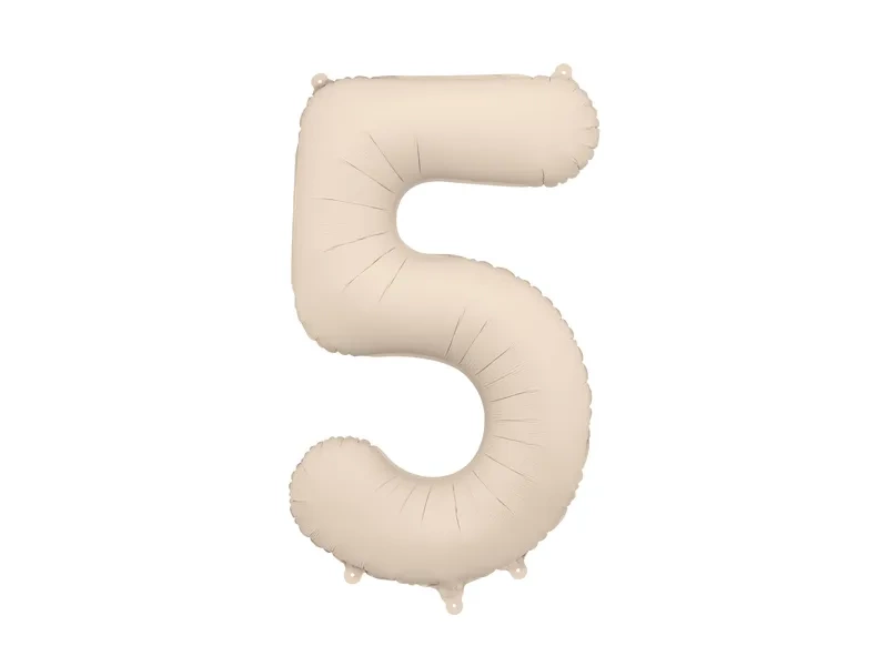 - Balon foliowy matowy Cyfra 5 w kolorze jasnobeżowym, rozmiar przed napompowaniem ok. 100 cm (39''), rozmiar po napompowaniu ok. 86 cm (34'').