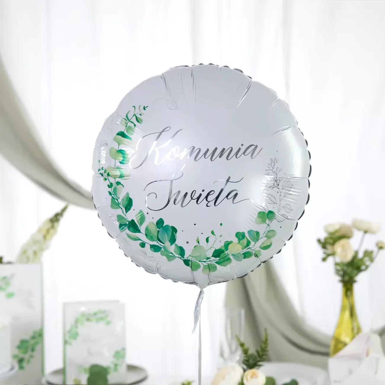 • Na balonie znajduje się finezyjny, srebrny napis Komunia Święta otoczony wianuszkiem z zielonych i srebrnych liści eukaliptusa
