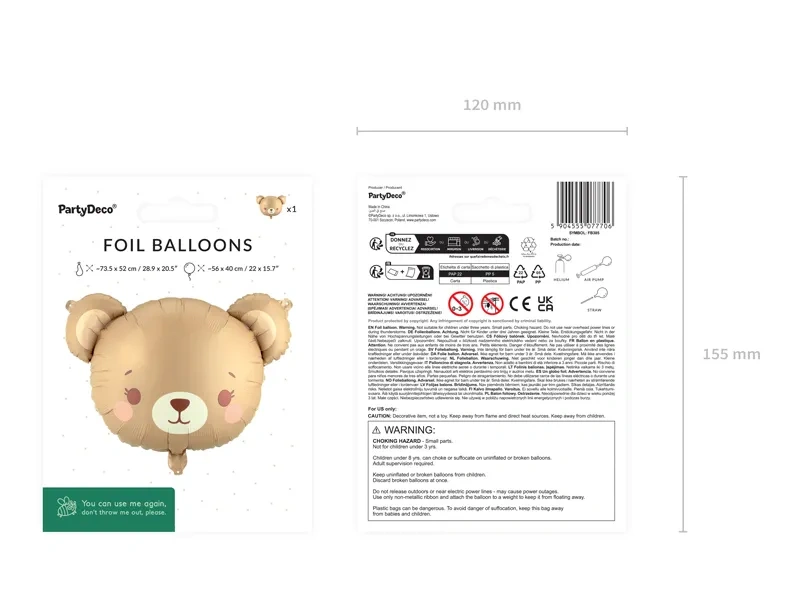 - Balon foliowy Miś, w kolorze ciemnobeżowo-brązowym. Wymiary przed napompowaniem ok. 73,5 x 52 cm (28,9 x 20,5''), wymiary po napompowaniu ok. 56 x 40 cm (22 x 15,7''). Do napompowania powietrzem i helem. Zestaw zawiera słomkę.