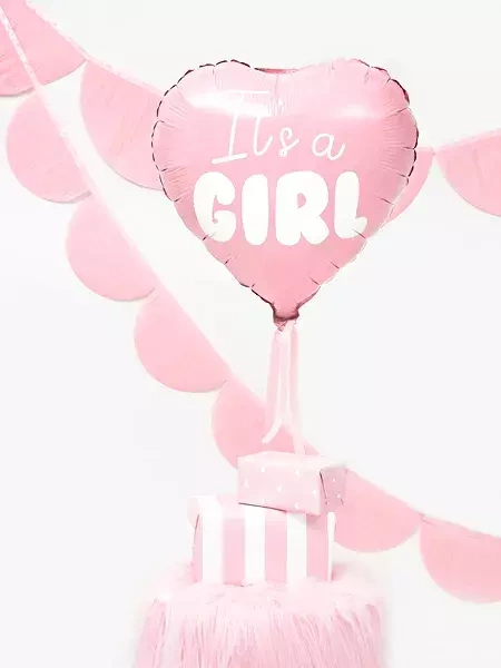 - Balon foliowy pastelowy Serce w kolorze jasnoróżowym z białym napisem It's a girl,