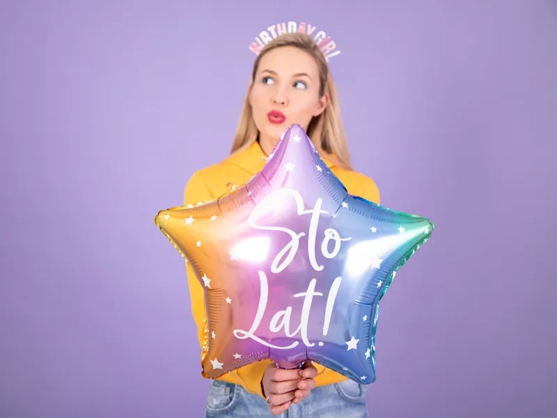 • Błyszczący balon foliowy w kształcie gwiazdki, mix kolorów z białym napisem Sto Lat!, rozmiar przed napompowaniem ok. 47 cm (18.5''), rozmiar po napompowaniu ok. 40 cm (15.5''). Do napompowania powietrzem i helem.
