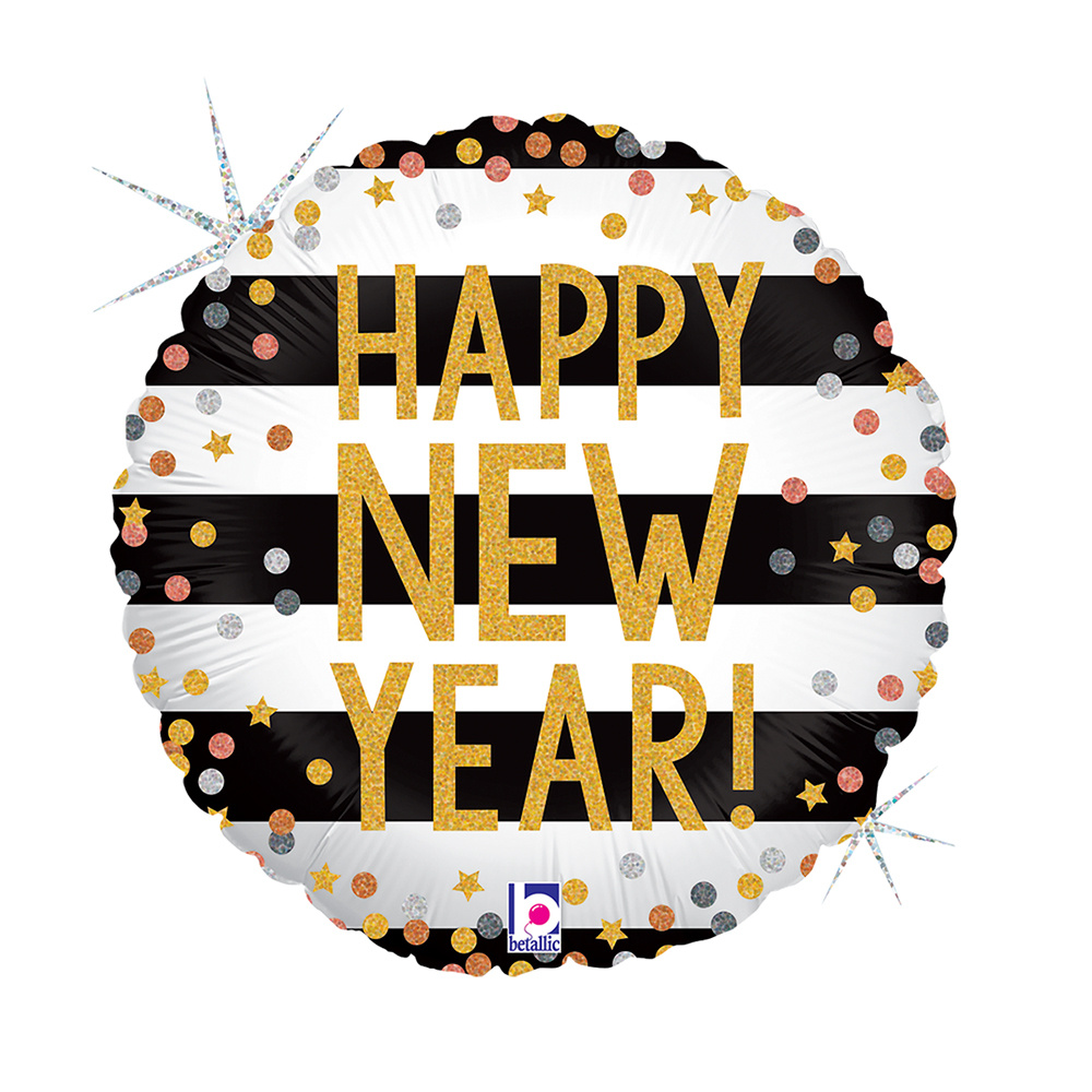 - Balon Grabo 18'' New Year Confetti Glitter hol, wymiary przed napompowaniem ok. 45 cm (18''), wymiary po napompowaniu ok. 35 cm (14 '').