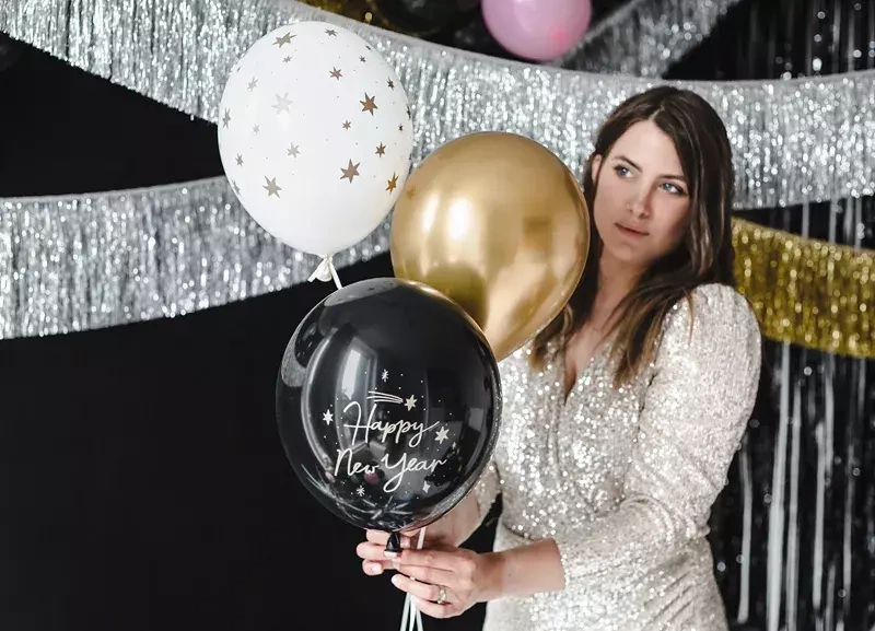 - Balony Strong Happy New Year z nadrukami, zestaw zawiera 2 wzory: w kolorze białym ze złotym pięciostronnym nadrukiem, w kolorze czarnym ze złotym dwustronnym nadrukiem, średnica ok. 30 cm.