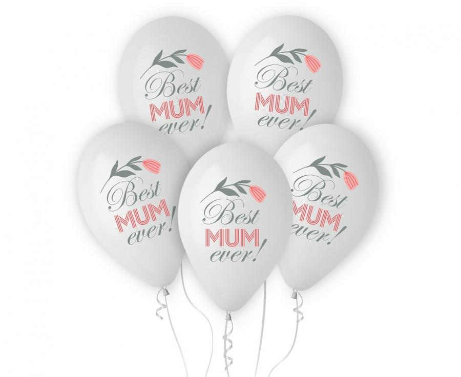 Białe balony z nadrukiem w postaci tekstu "Best Mum Ever".