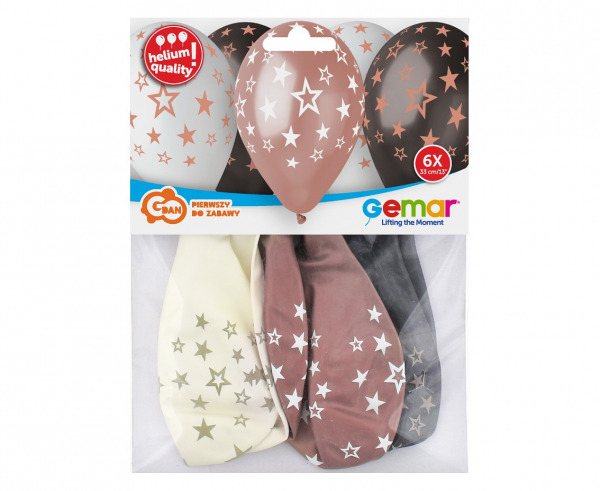 - W opakowaniu znajduje się 6 balonów w kolorze białym, czarnym i różowym z nadrukiem gwiazdek.