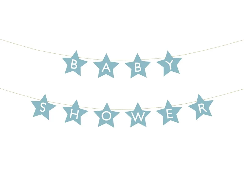 - Baner w kształcie gwiazdek z napisem Baby Shower wykonany z papieru w kolorze jasnoniebieskim,