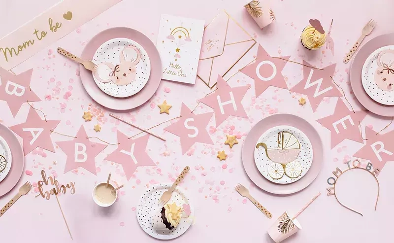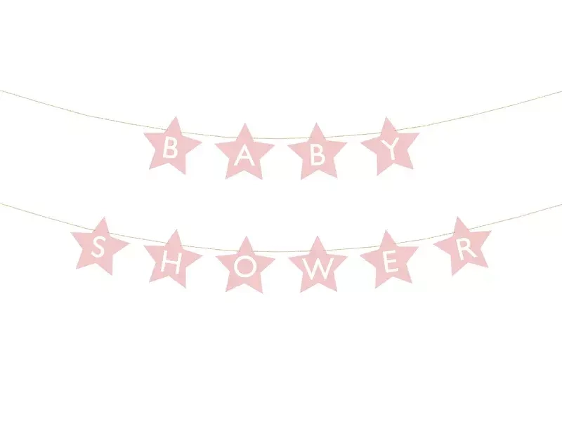 - Baner w kształcie gwiazdek z napisem Baby Shower wykonany z papieru w kolorze jasnoróżowym,