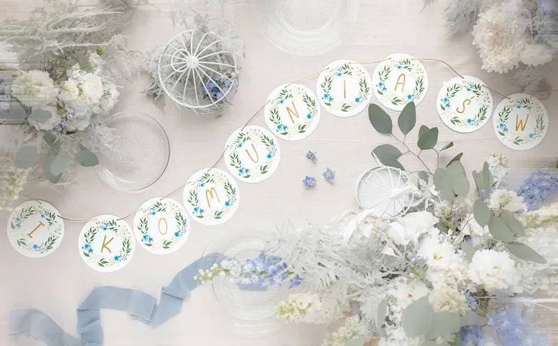 - Baner ''I Komunia Św.'' wykonany z papieru, mix kolorów. Wysokość ok. 13 cm, długość sznurka ok. 2 m.