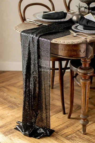 - Bieżnik z siateczki dekoracyjnej z cekinami w kolorze czarnym, szerokość ok. 30 cm, długość ok. 5 m.