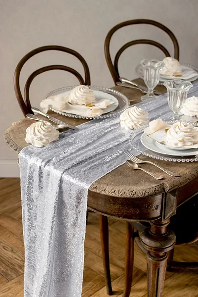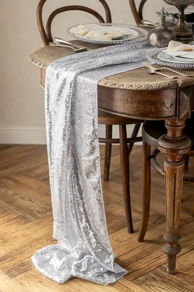 - Bieżnik z siateczki dekoracyjnej z cekinami w kolorze srebrnym, szerokość ok. 30 cm,