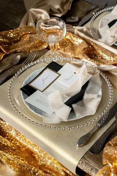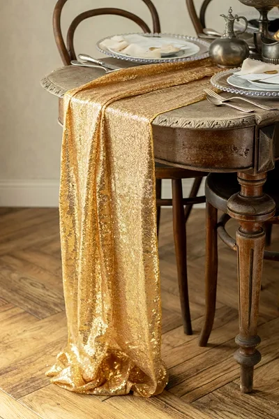 - Bieżnik z siateczki dekoracyjnej z cekinami w kolorze złotym, szerokość ok. 30 cm,