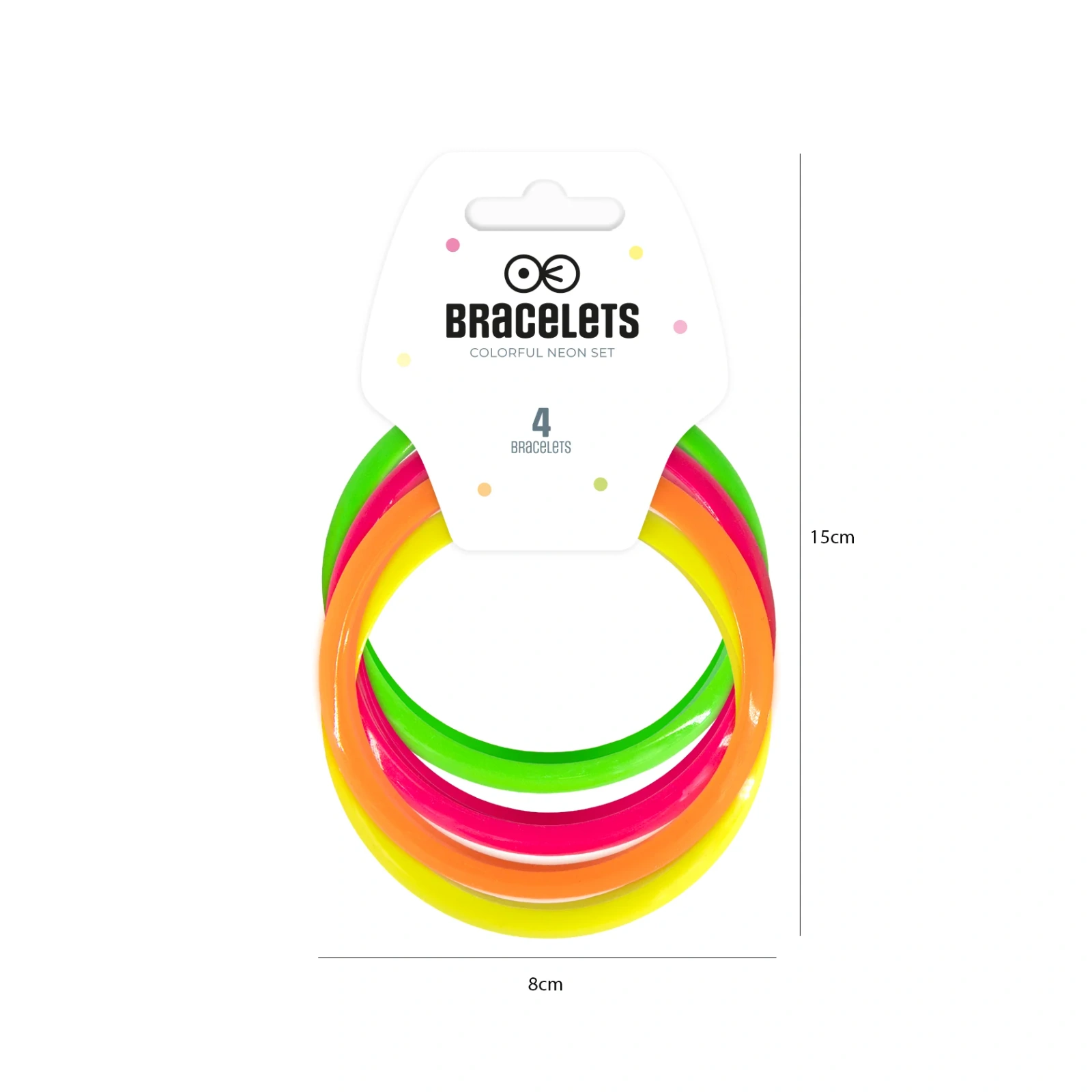 Zestaw zawiera cztery bransoletki w różnych neonowych kolorach (m.in. róż, zieleń, żółć, pomarańcz), dzięki czemu możesz bawić się modą i za każdym razem układać je inaczej. Gładka powierzchnia, lekka konstrukcja i uniwersalny rozmiar sprawiają, że bransoletki są komfortowe w noszeniu zarówno dla nastolatek, jak i dorosłych kobiet.