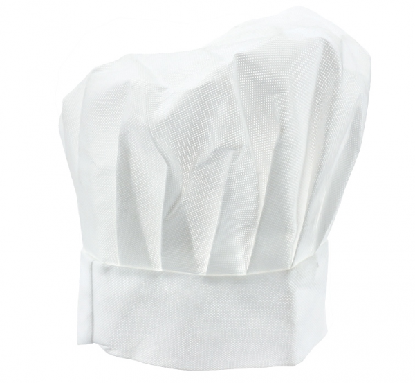 - Biała czapka kucharska uszyta z przyjemnego w dotyku materiału.