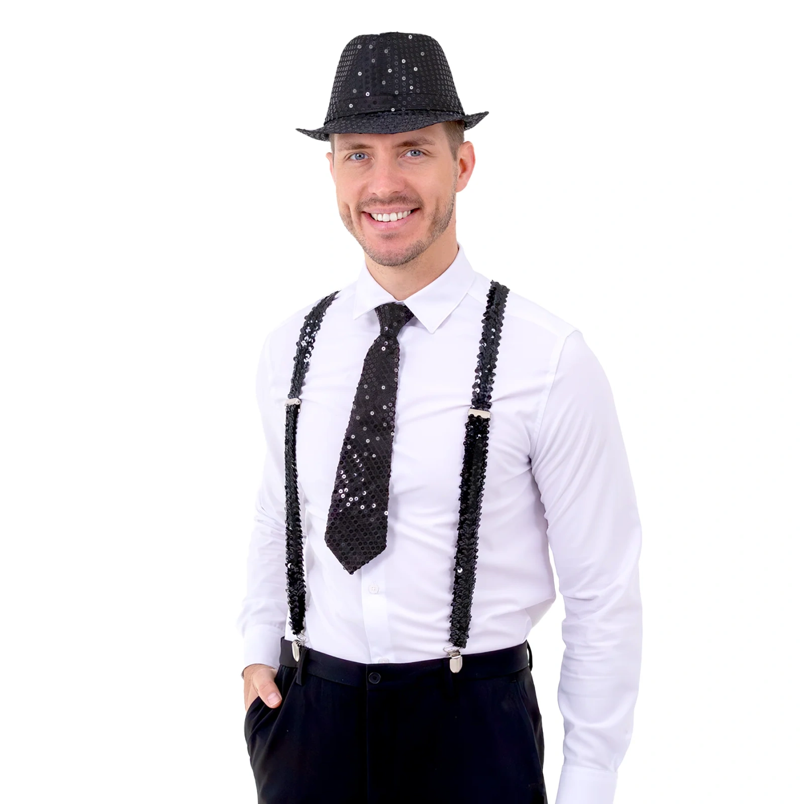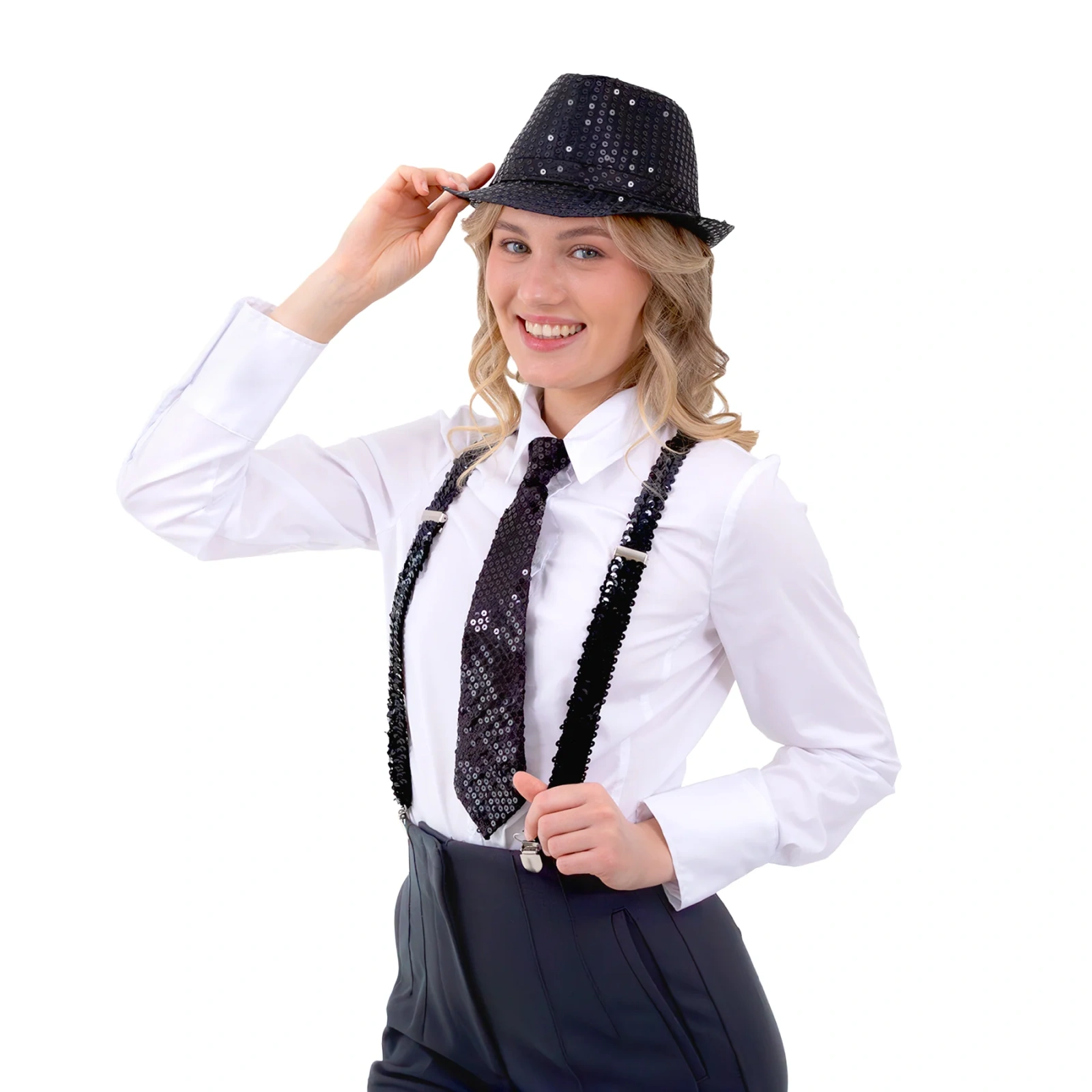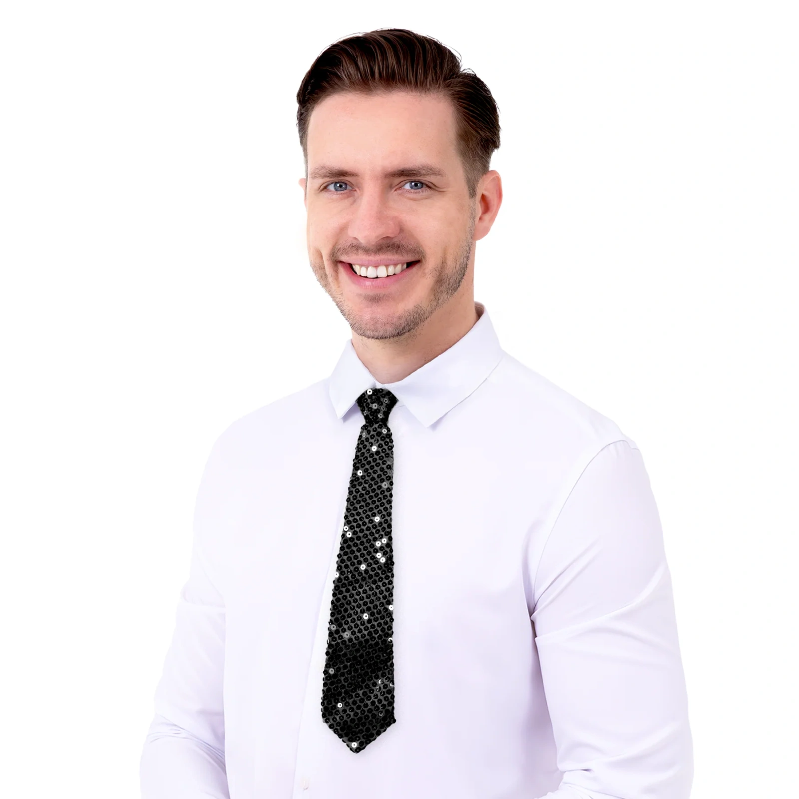 Stylowy, błyszczący krawat z cekinami to efektowny dodatek, który błyskawicznie odmieni każdą stylizację imprezową, estradową czy karnawałową. Dzięki eleganckiej czerni i połyskującej powierzchni akcesorium świetnie sprawdzi się zarówno u dorosłych, jak i u starszych dzieci na balu przebierańców, szkolnym przedstawieniu lub imprezie tematycznej. Lekka konstrukcja i praktyczne zapięcie pozwalają założyć krawat w kilka sekund, bez konieczności wiązania tradycyjnego węzła.