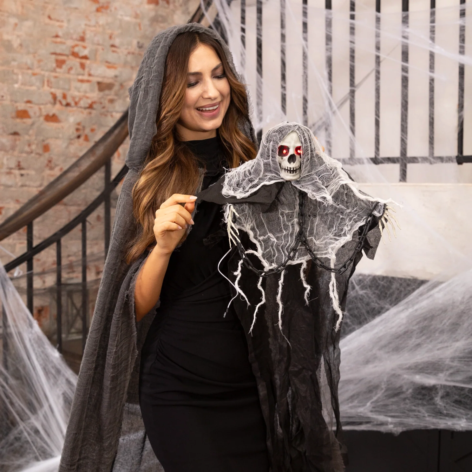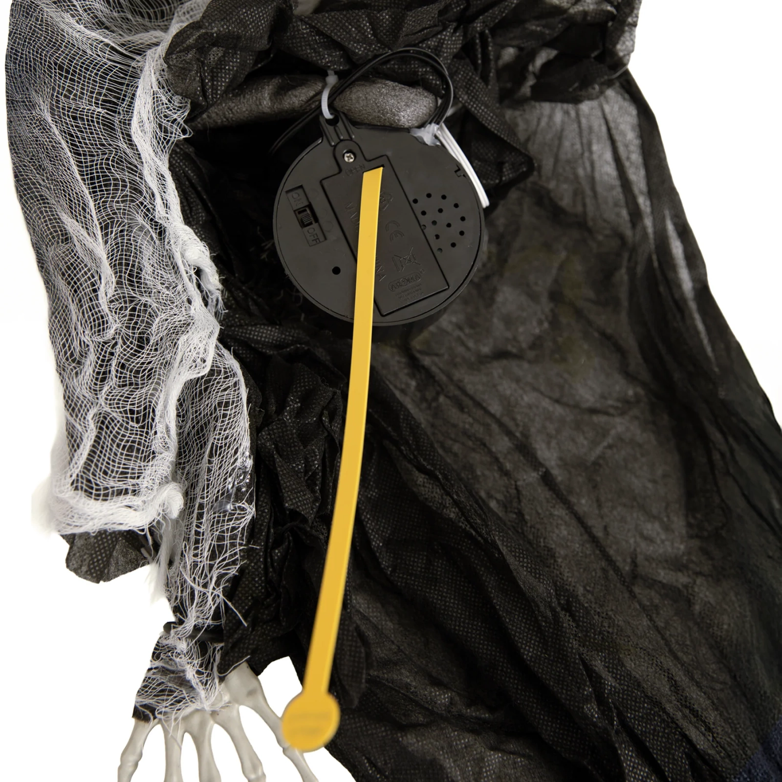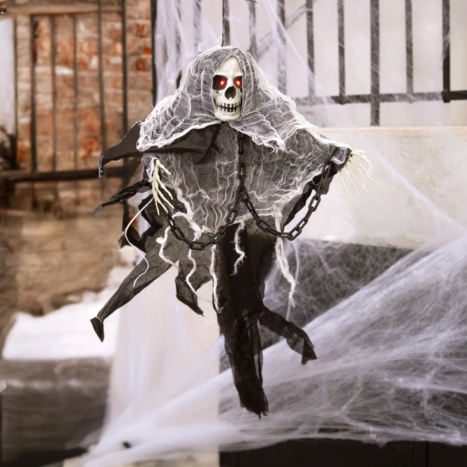 Dekoracja wisząca Kościotrup z łańcuchem oraz z efektem dźwiękowym i świetlnym. Wprowadzi prawdziwie mroczną atmosferę na Halloween!