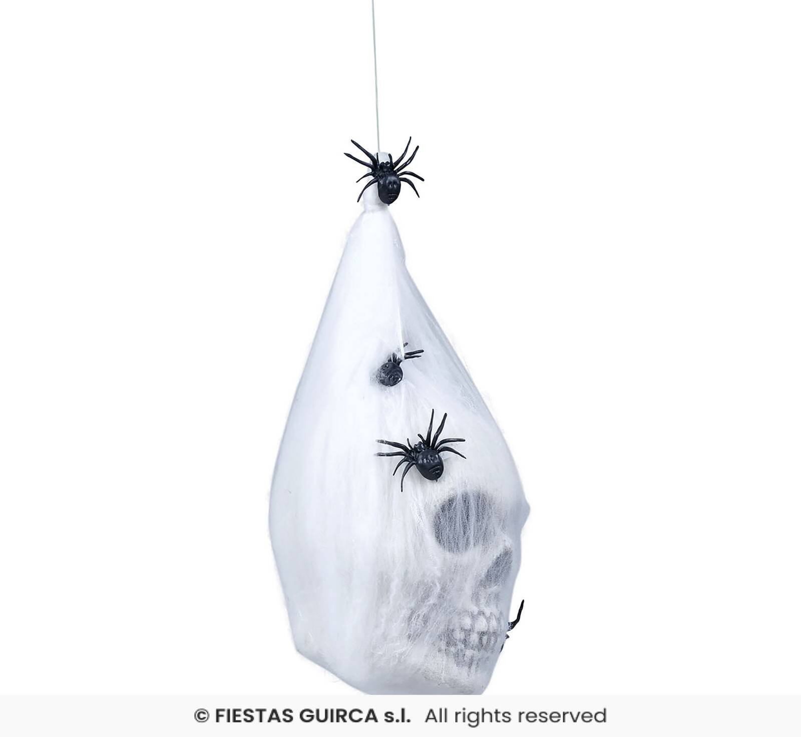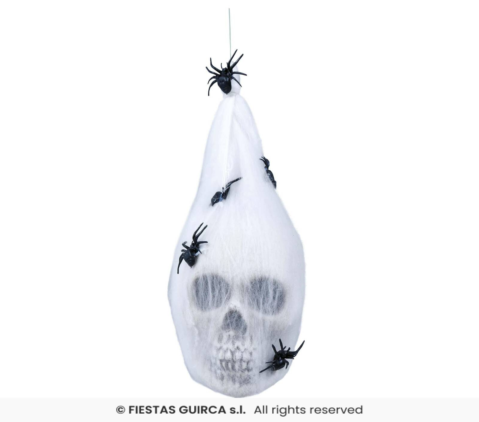 - Mroczna i przerażliwa dekoracja w postaci czaszki owiniętej w kokon z pajęczyny z pająkami