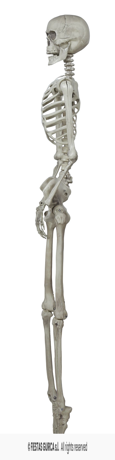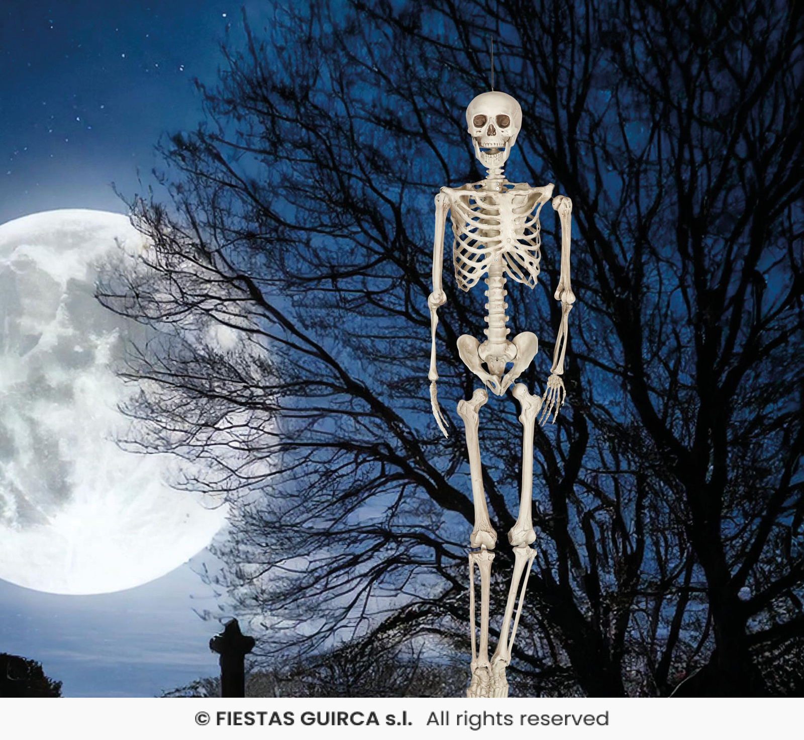 Ruchome kończyny, przerażający wyraz twarzy i klasyczna kolorystyka sprawiają, że ten szkielet pasuje zarówno do klimatu horroru, jak i czarnego humoru. To świetna dekoracja na Halloween, do domu strachu, klubu, sklepu lub sali imprezowej.