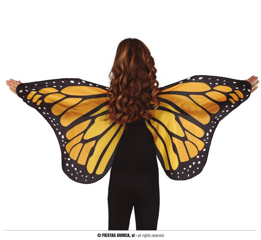 • Czarno-pomarańczowe skzrydła z białymi kropkami skrzydła wykonane z materiału. Końce skrzydeł mocowane na pętelkę do palca. Skrzydła zakładane na ramiona na tasiemki ( jak plecak)