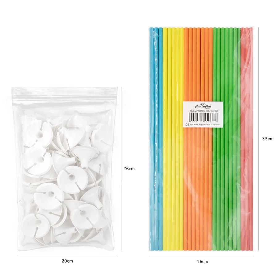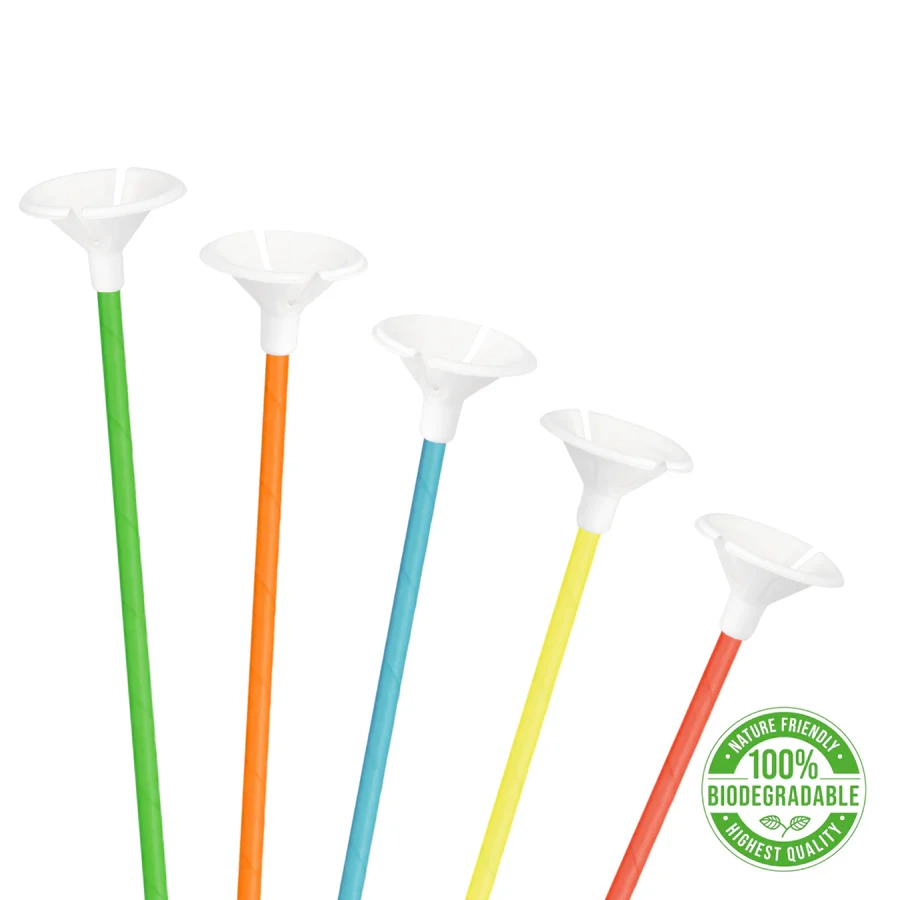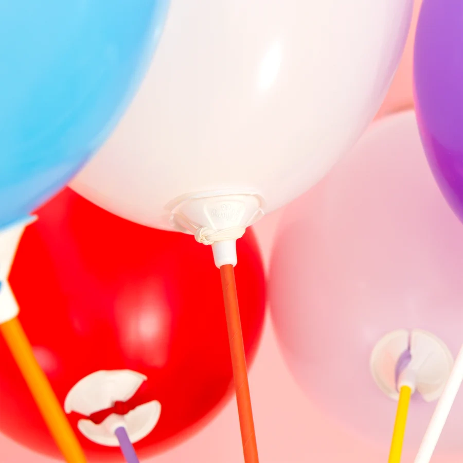 - Przyjazne dla środowiska patyczki do balonów oraz zatyczki w 5 kolorach: żółty, pomarańczowy, czerwony, niebieski, zielony.