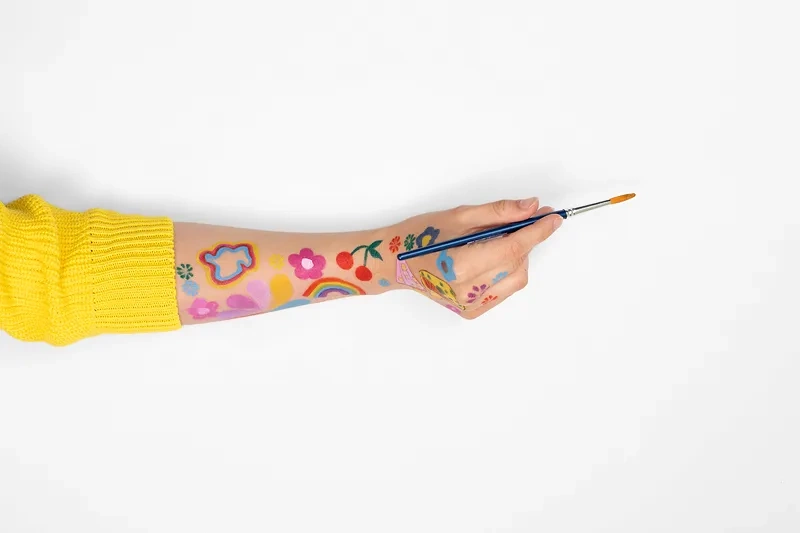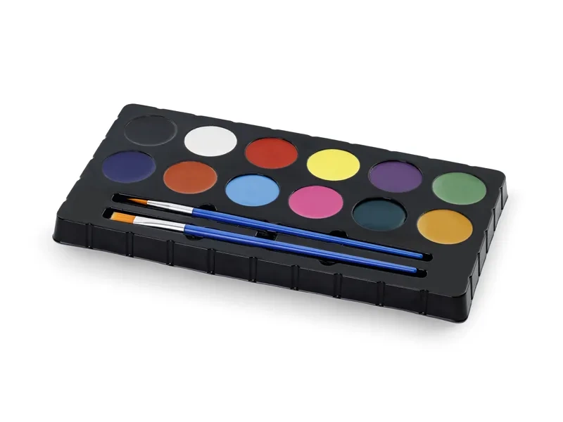 - Farbki do malowania twarzy, zestaw zawiera 2 pędzelki oraz składa się z 12 kolorów: jasny zielony, ciemny żółty, ciemny zielony, fioletowy, żółty, różowy, czerwony, błękitny, biały, brązowy, czarny, granatowy.