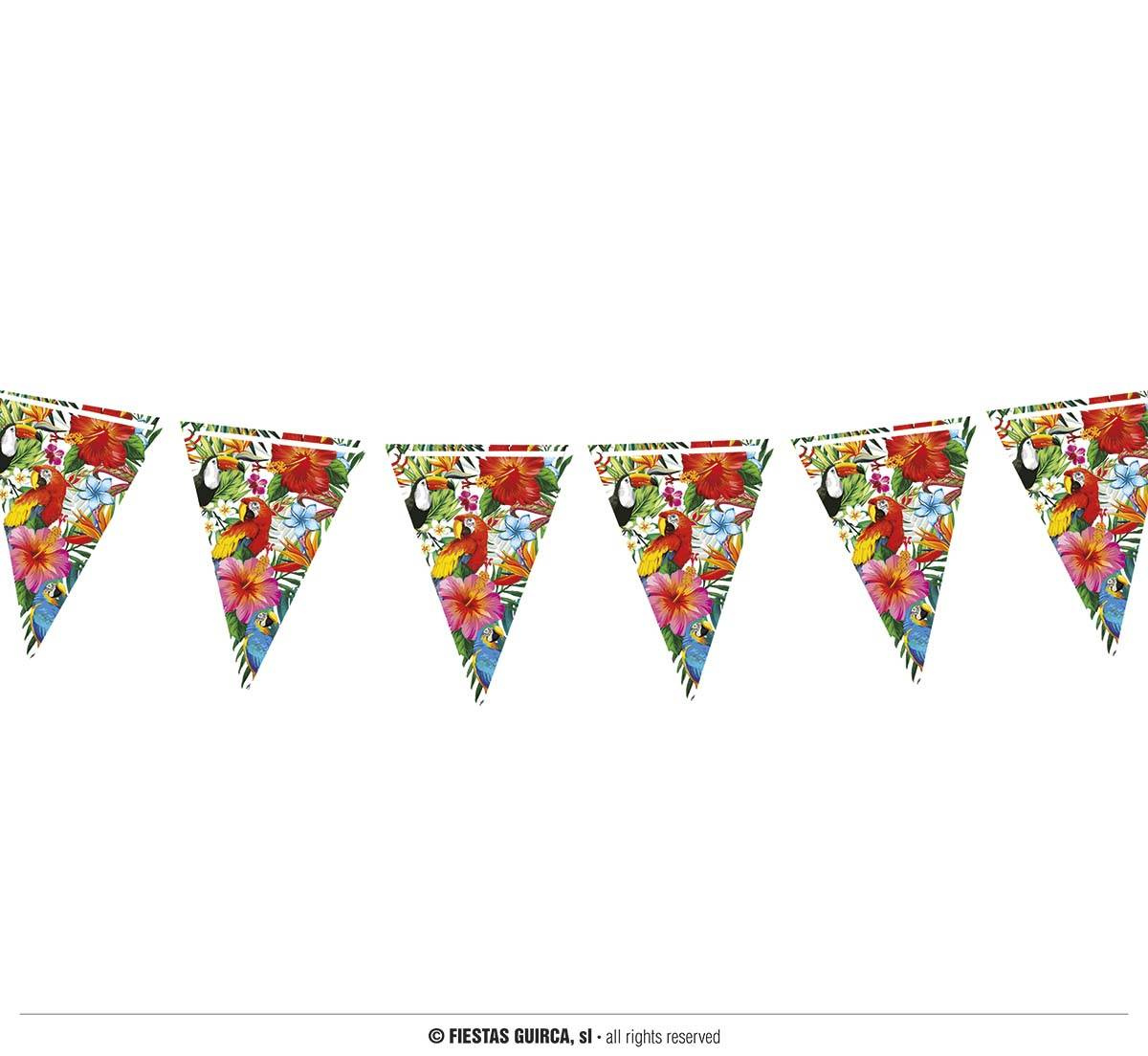 • Flagi papierowe z nadrukiem tropikalnych kwiatów, papugi oraz tukana