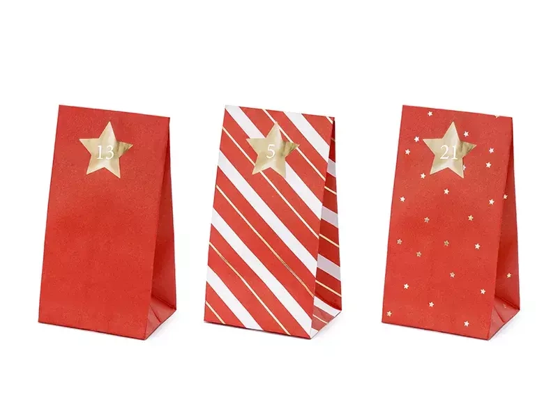 • zestaw zawiera: 3 wzory papierowych torebek w kolorze czerwonym ( 2 wzory mają złoty metalizowany nadruk), po 8 z każdego wzoru i 24 złote naklejki z białym nadrukiem numerów od 1 do 24.