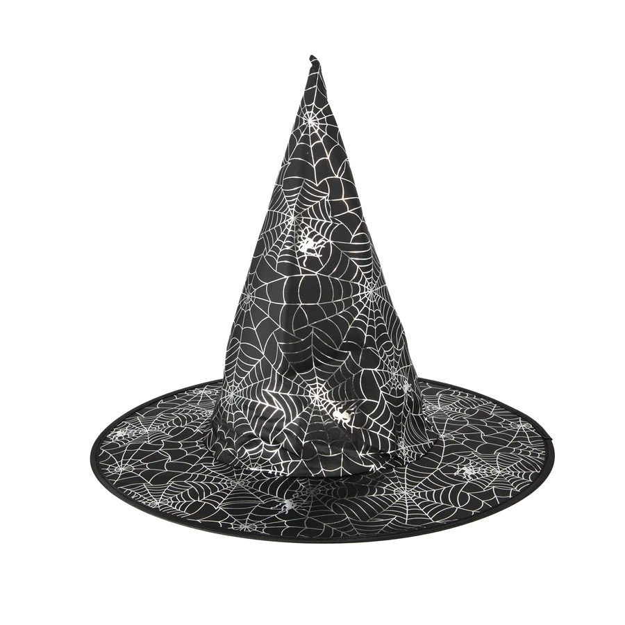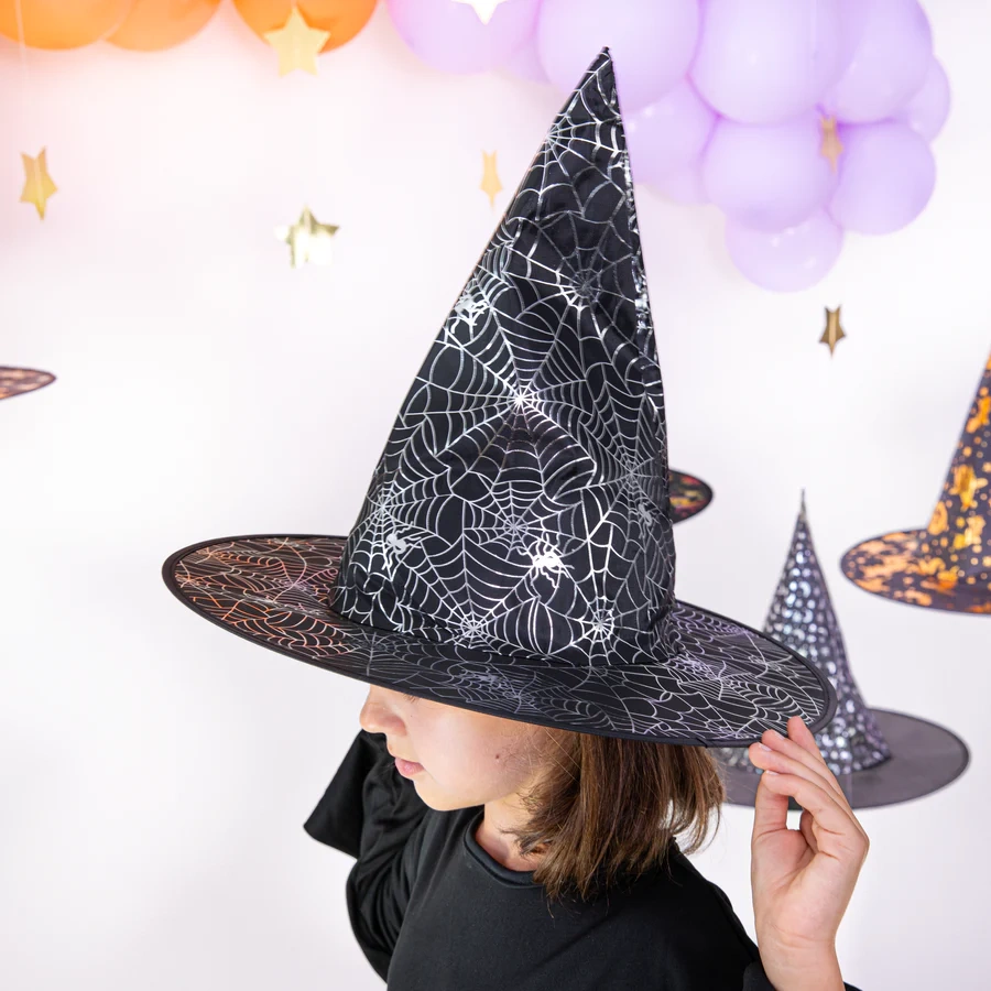 - Srebrne pajęczyny gęsto pokrywają kapelusz wiedźmy. Oczywiście nie zabrakło też pająków. Klasyczne zdobienie pięknie podkreśla czerń tła.
