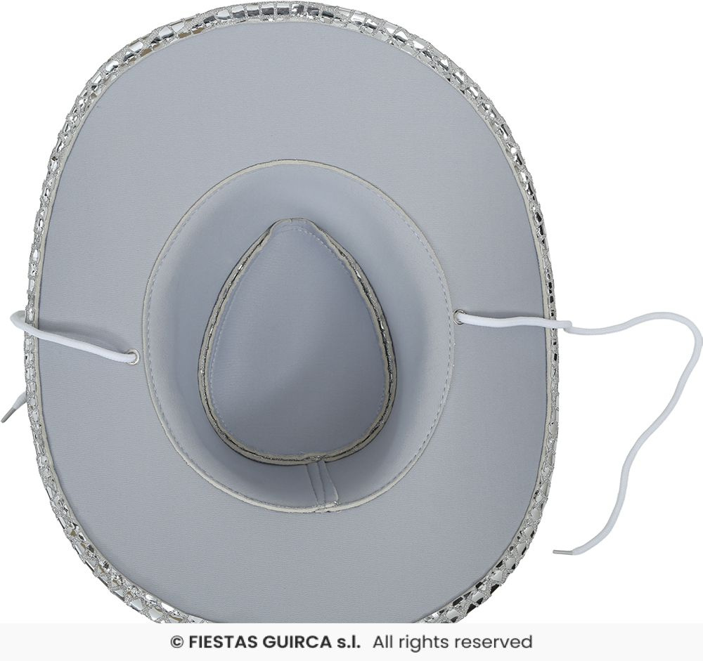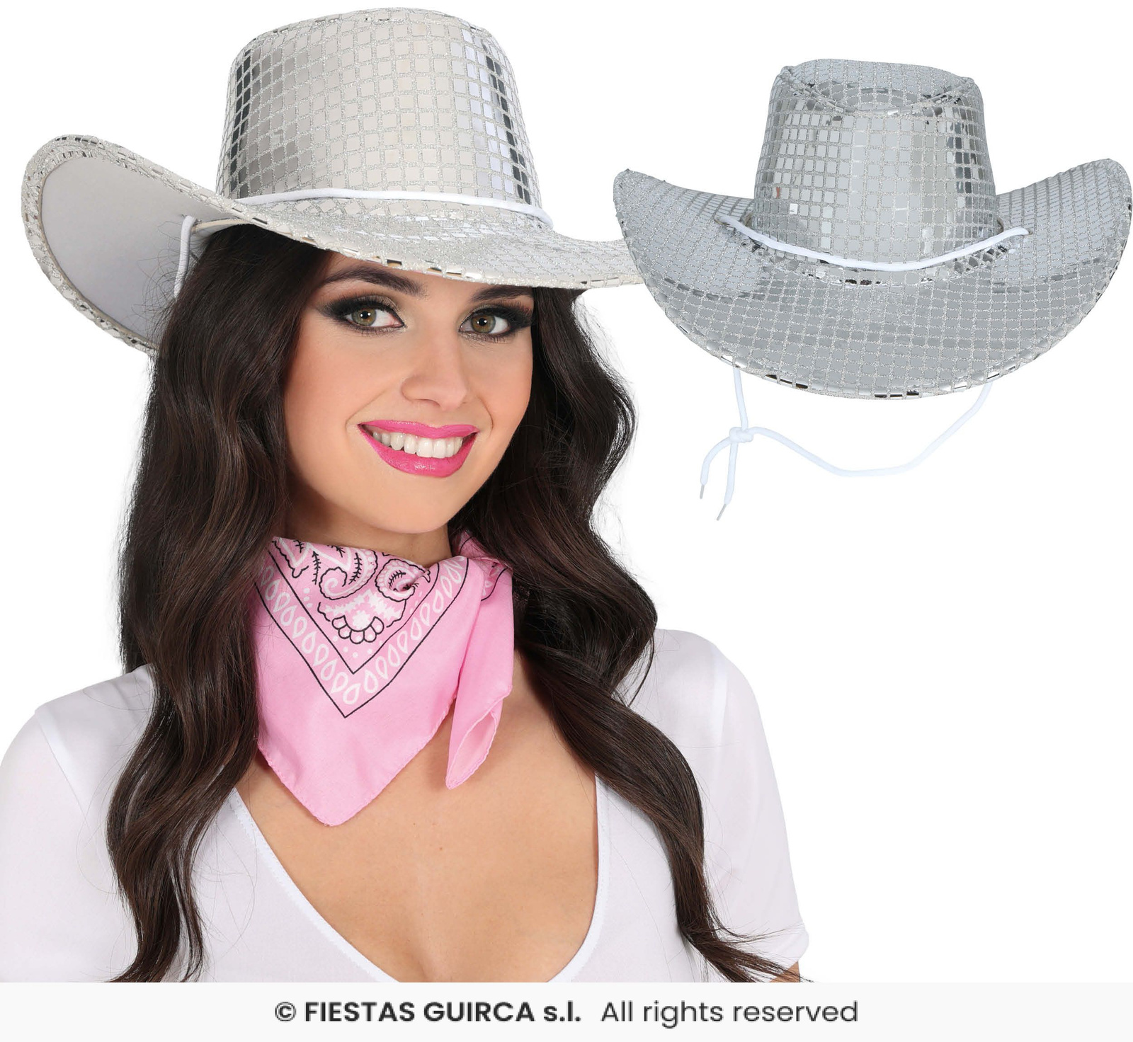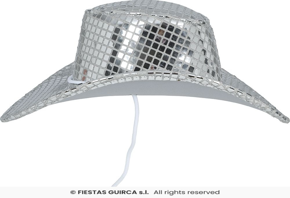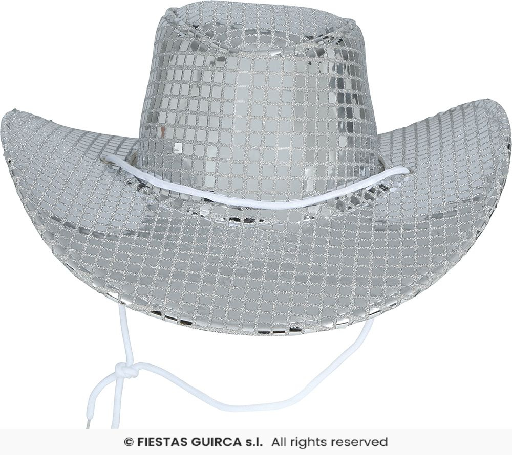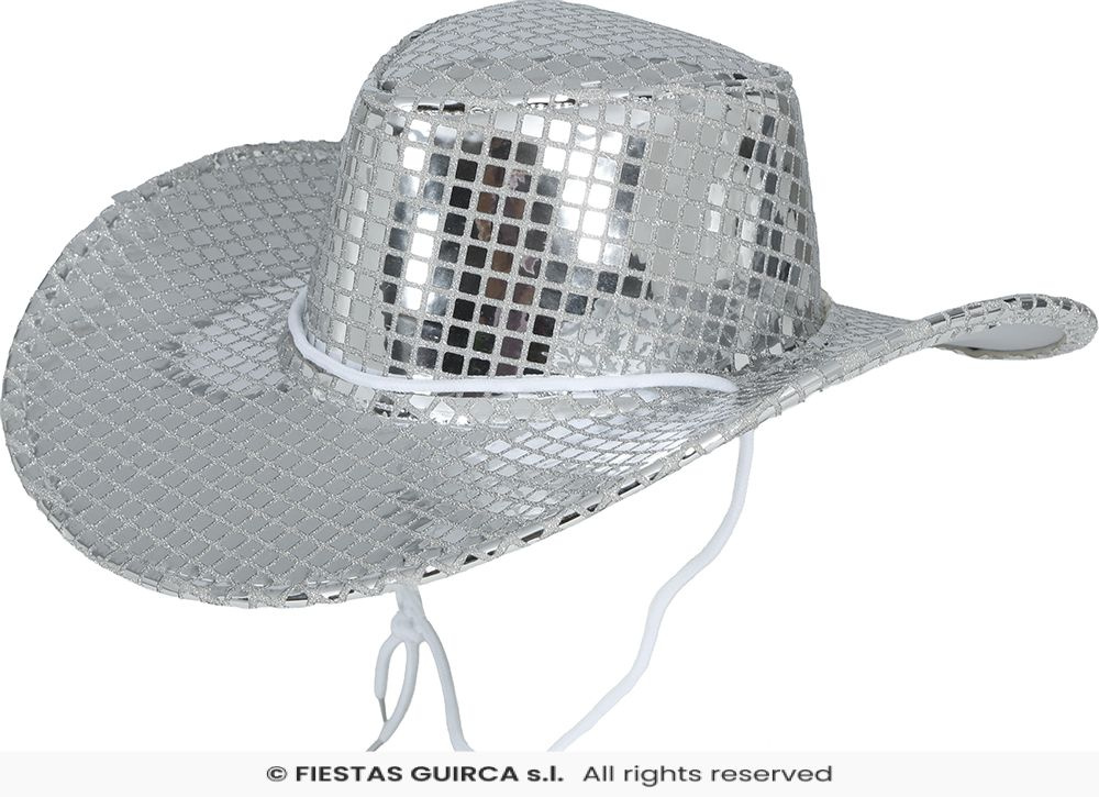- Kapelusz kowbojski w stylu lat 80, ozdobiony błyszczącym srebrnym materiałem imitującym kulę dyskotekową.