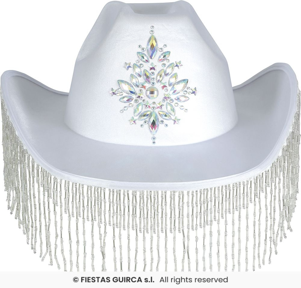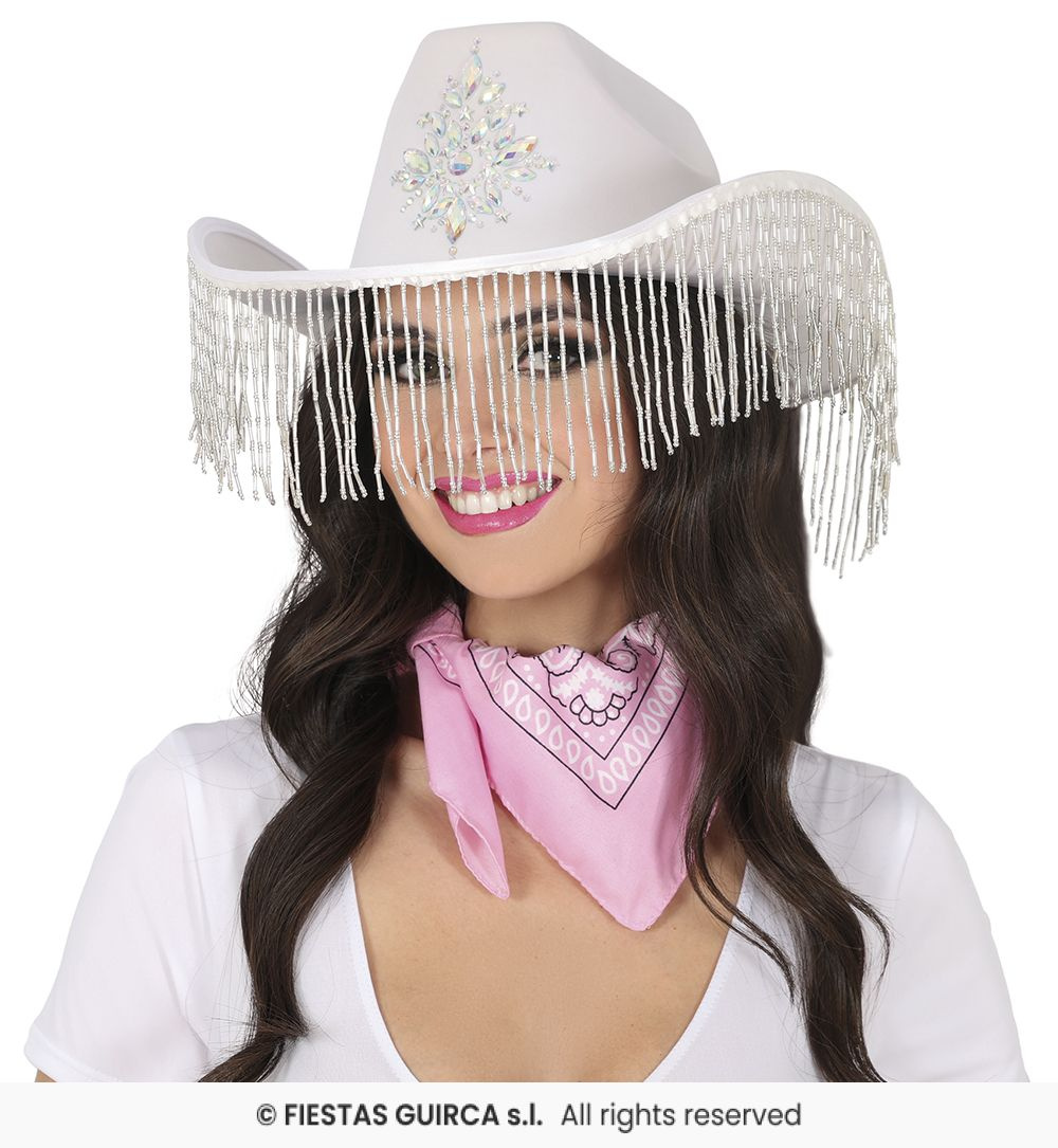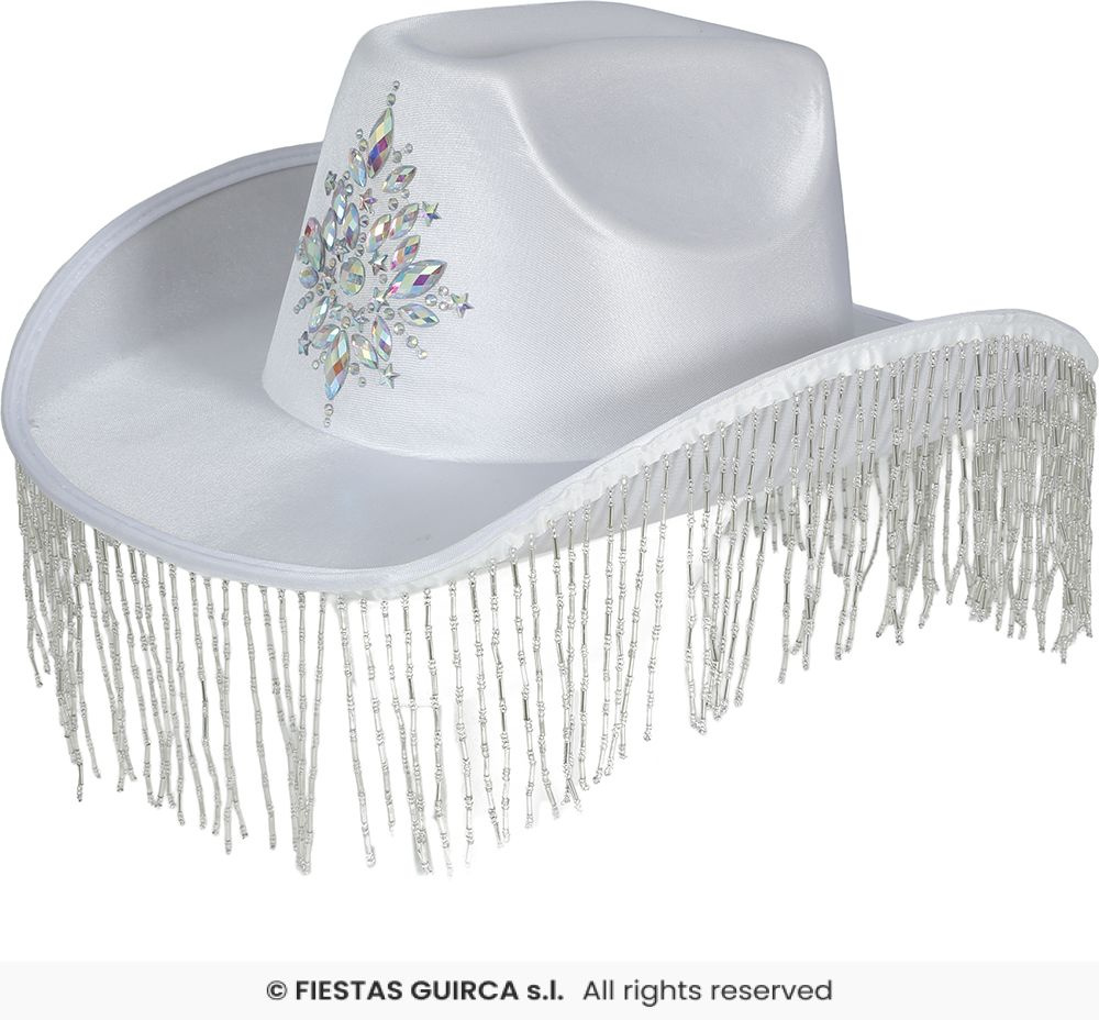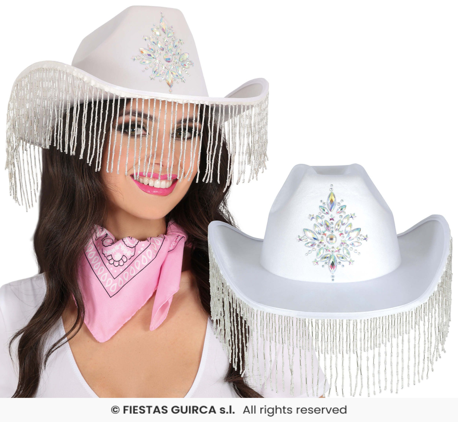 • Kapelusz kowbojski z ozdobnymi wiszącymi koralikami oraz zdobieniem z krysztalików Świetny dodatkowe do stroju Barbie, Kowbojki oraz jako gadżet na imprezę karnawałową.