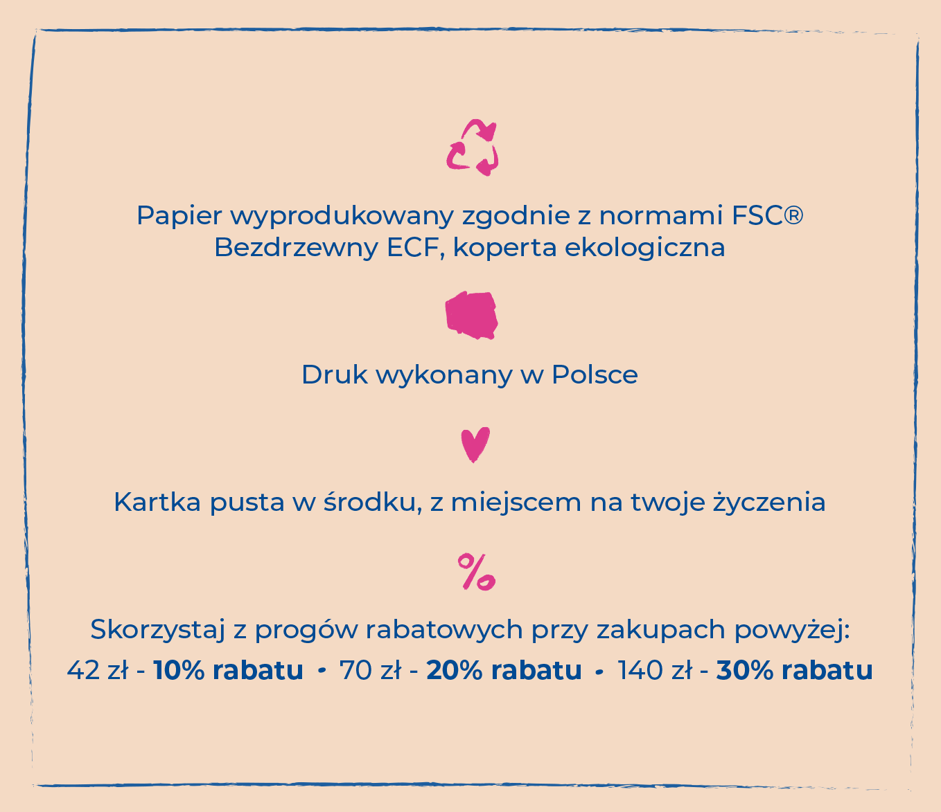 - Otwierana kartka, pusta w środku, wykonana na papierze (z certyfikatem EFC) z wyraźnie widoczną fakturą.