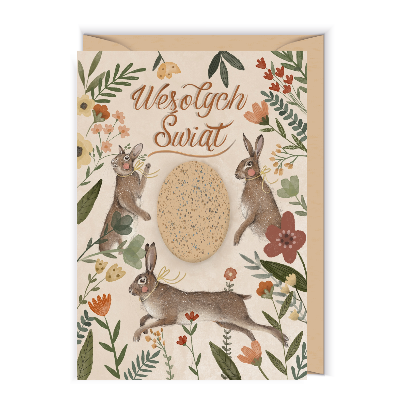 Otwierana kartka, pusta w środku, wykonana na papierze (z certyfikatem EFC) z wyraźnie widoczną fakturą. W zestawie ekologiczna koperta.