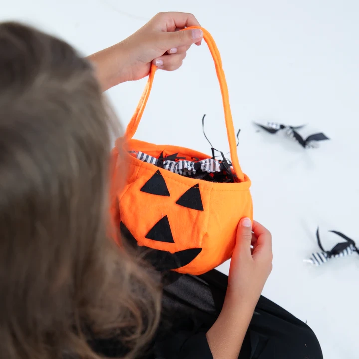 Koszyk na cukierki w kształcie dyni to idealny element przebrania w Halloween. Wykonany z delikatnego pomarańczowego filcu