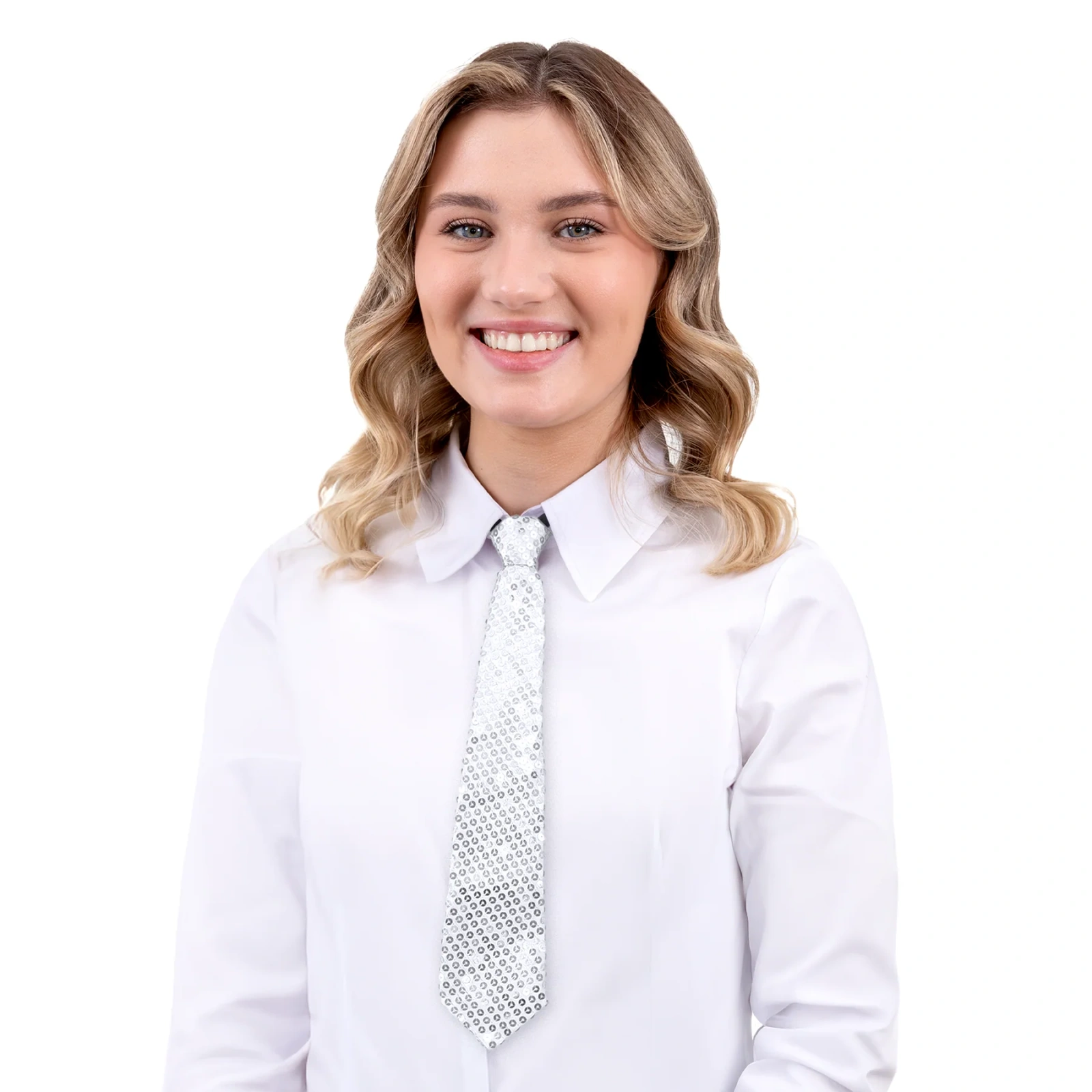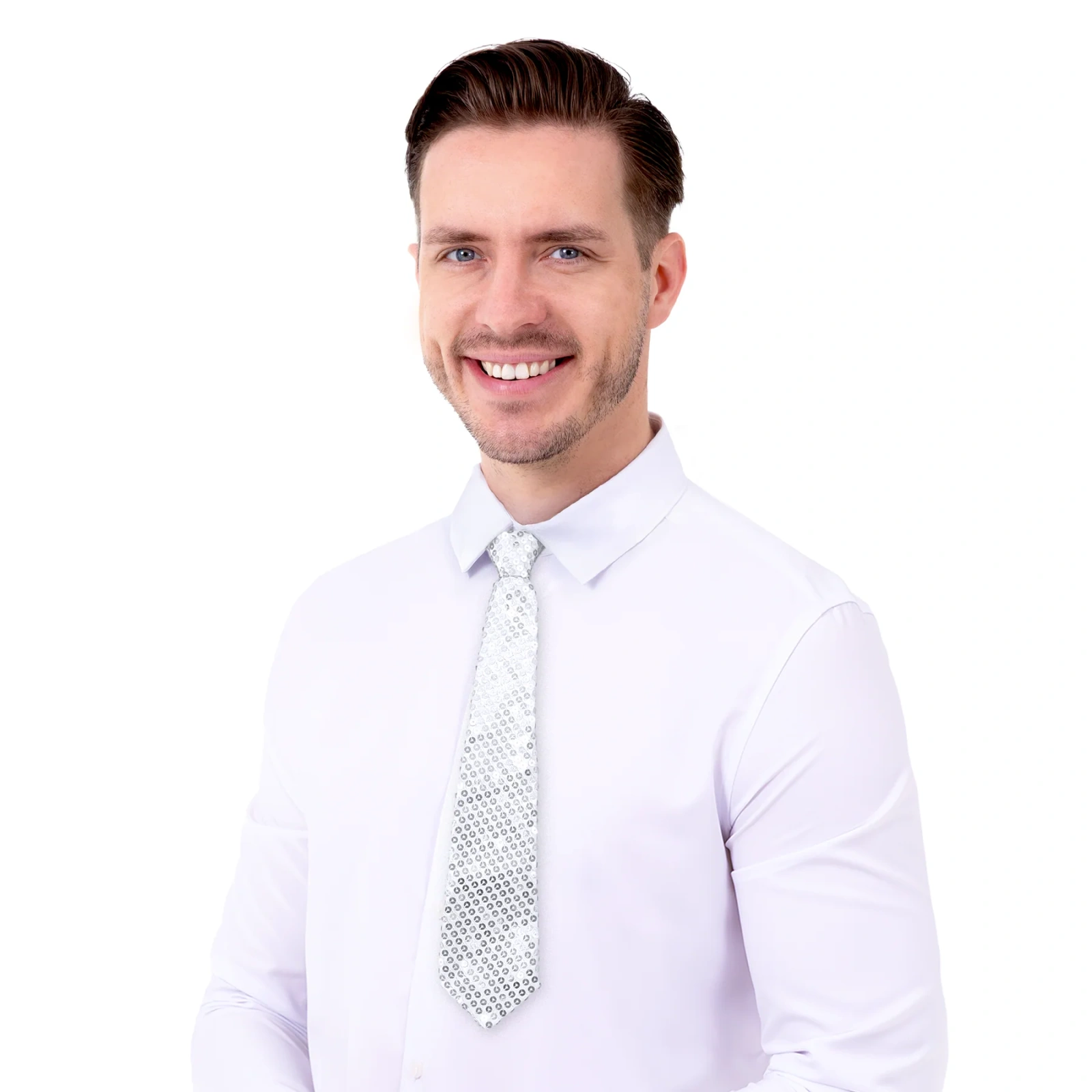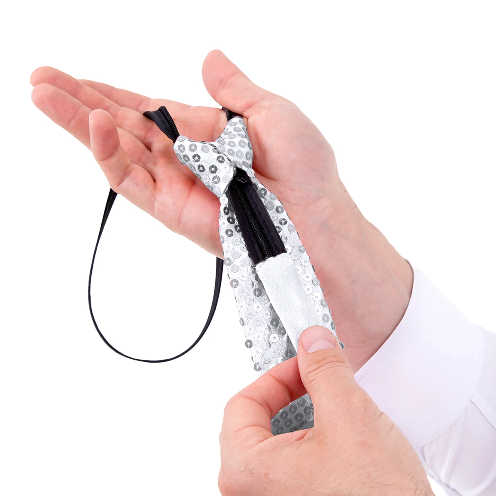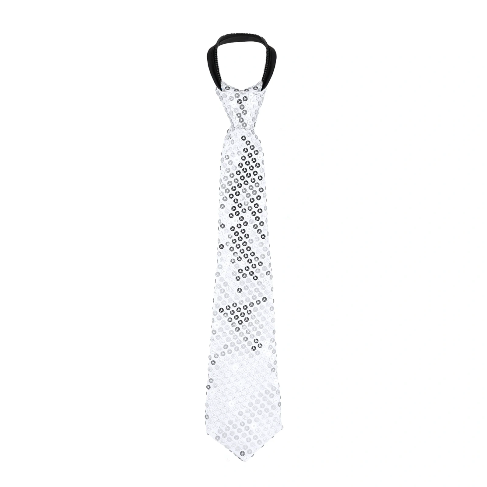 Srebrny krawat cekinowy – efektowny dodatek na imprezy, bale i wydarzenia tematyczne