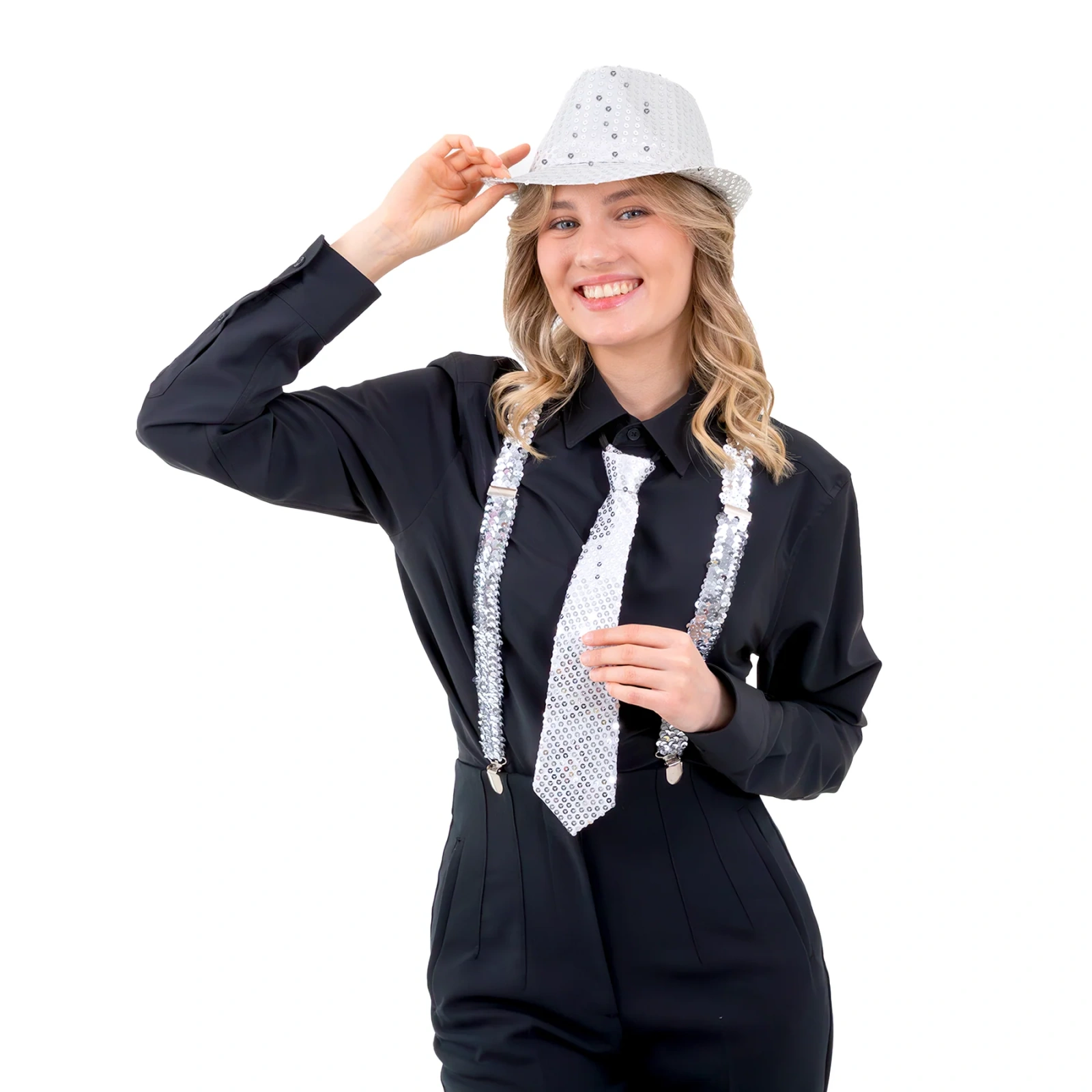 Jednocześnie taki sposób pakowania pozwala elastycznie tworzyć zestawy akcesoriów – do srebrnego krawata można dobrać inne świecące elementy, takie jak kapelusze, muszki, szelki czy rękawiczki. Komponując je indywidualnie, z łatwością stworzysz spójny, imprezowy look odpowiadający charakterowi wydarzenia, niezależnie od tego, czy będzie to kameralna domówka, tematyczna sesja zdjęciowa, czy duża gala firmowa.