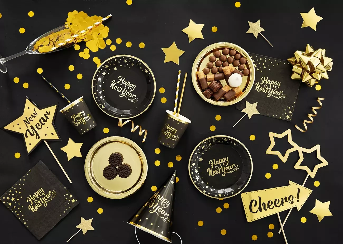 • Elegancki czarny kubeczek w złote gwiazdki z napisem Happy New Year. Na sylwestrowym stole, na bufecie czy w barze doskonale spełni swoją funkcję - estetyczną i praktyczną.