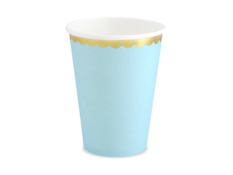 - Kubeczki papierowe w kolorze jasnoniebieskim ze złotymi metalizowanymi brzegami,