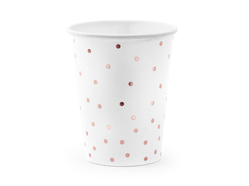 - Białe kubeczki papierowe ze wzorem kropek w kolorze różowego złota.