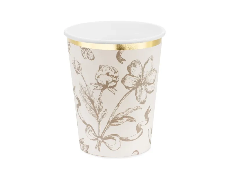- Kubeczki papierowe w kolorze beżowym z ciemnobeżowymi kwiatami oraz złotym błyszczącym nadrukiem.