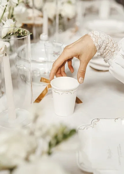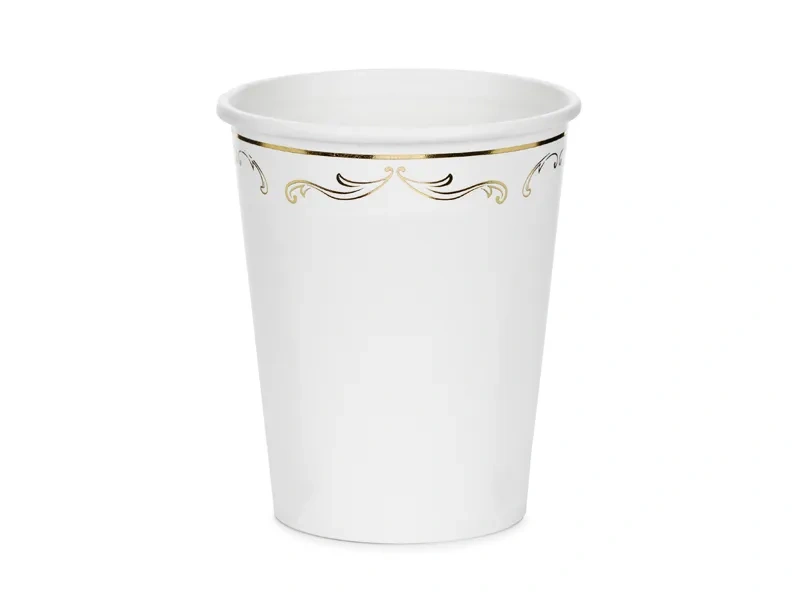 • Kubeczki papierowe w kolorze białym ze złotym ornamentem., pojemność ok. 220 ml (7.4 oz)