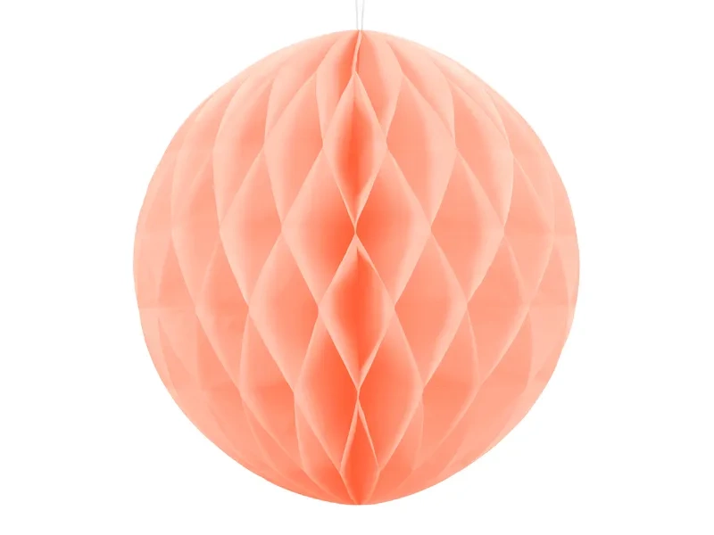 • Kula bibułowa w kolorze jasnobrzoskwiniowym o średnicy około 40 centymetrów. Produkt wielokrotnego użytku. Montaż przy pomocy spinacza.