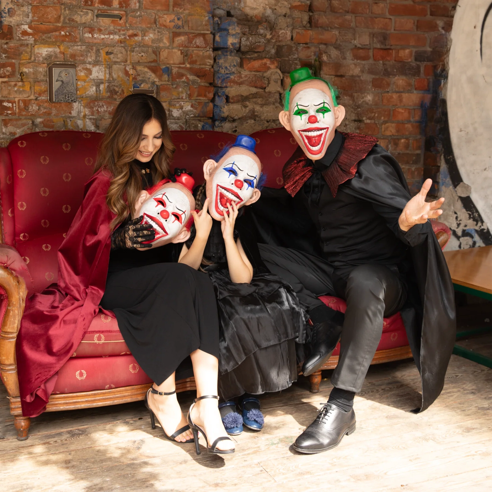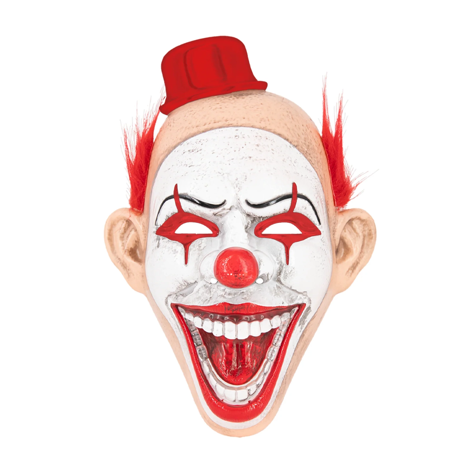 - Maska klauna doskonała dla osób, które chcą wprowadzić atmosferę napięcia i dreszczyku emocji. Szeroki uśmiech i mini kapelusik w intensywnym kolorze dodaje groteskowego uroku.
