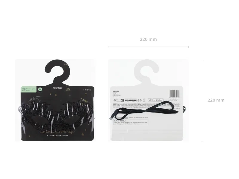 - Maska karnawałowa koronkowa w kolorze czarnym, wysokość ok. 8 cm, szerokość ok. 21 cm. Maska wiązana jest z tyłu czarnymi tasiemkami.