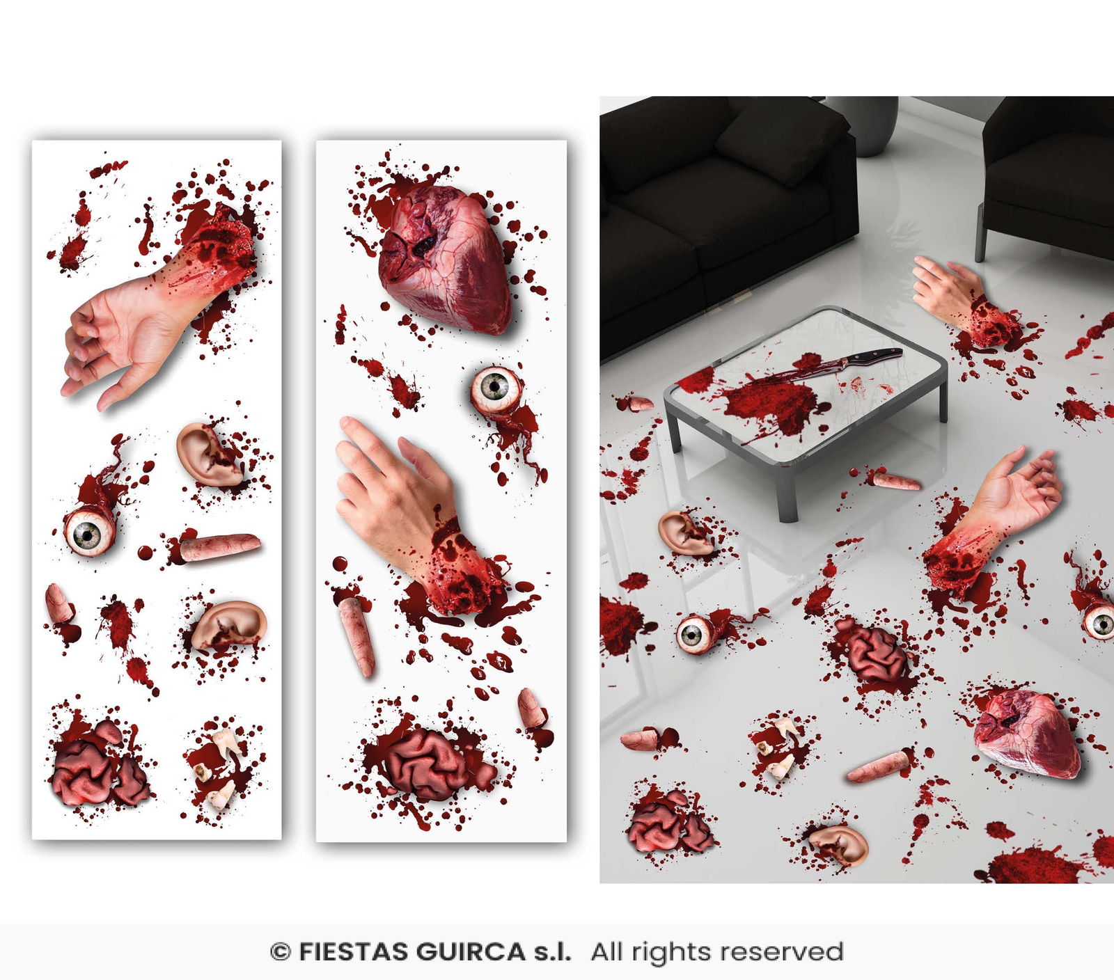 W zestawie znajdziesz realistycznie odwzorowane grafiki przedstawiające odcięte dłonie, palce, stopy i inne fragmenty ciała. Naklejki doskonale imitują krwawe rany, dzięki czemu świetnie sprawdzą się na drzwiach, lustrze, ścianie, podłodze, a nawet oknach. Można je wykorzystać jako samodzielną dekorację lub część większej instalacji – np. w połączeniu z taśmą policyjną, torbą na zwłoki, sztuczną krwią czy pajęczyną.