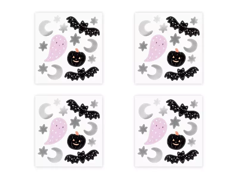 - Naklejki na ścianę Halloween, mix wzorów i kolorów, zestaw zawiera 14 naklejek na blistrze.