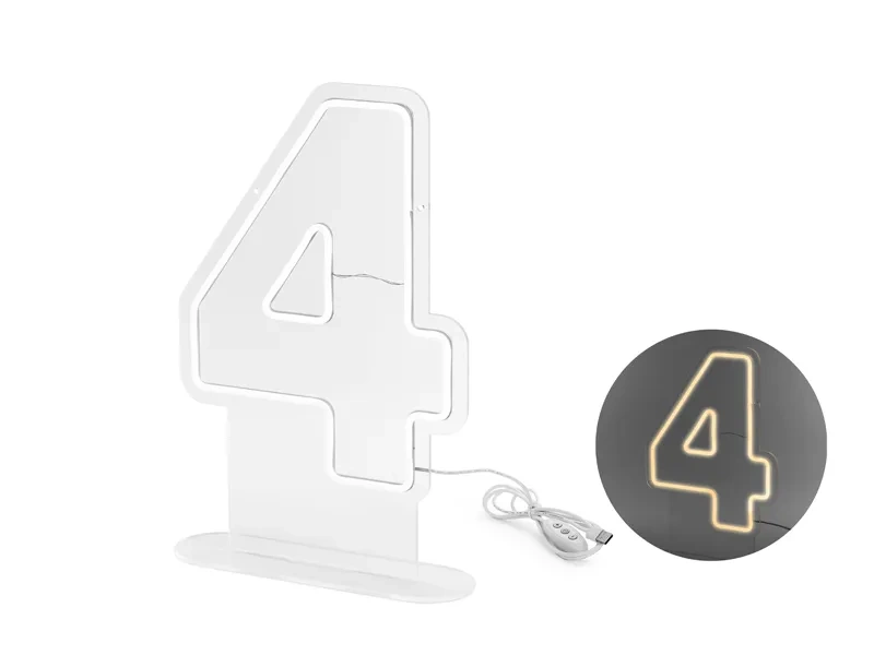 • Neon LED - Cyfra ''4'' w kolorze białym na przeźroczystym tle o ciepłej białej barwie światła, wysokość ok. 50 cm, długość kabla z wtyczką ok. 1,5 m. Możliwość regulacji intensywności świecenia.