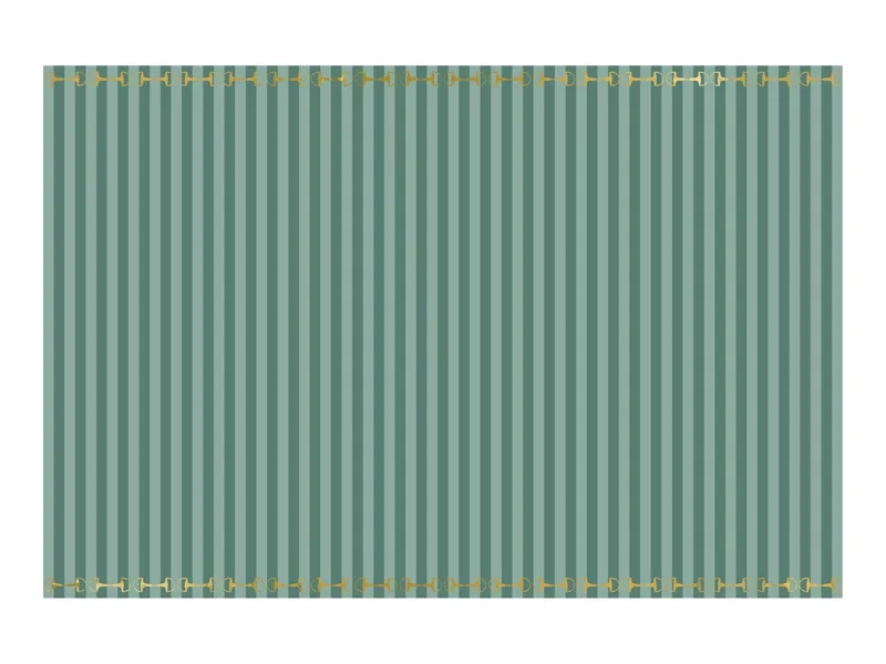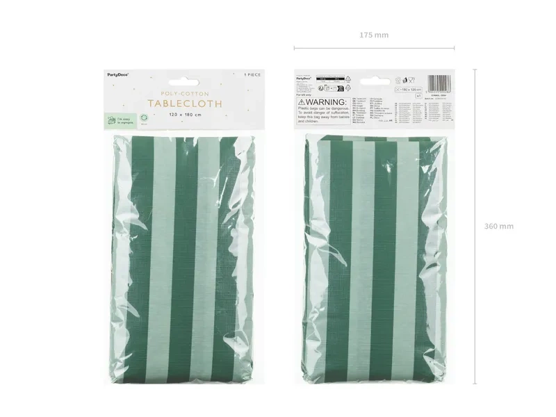 - Jednorazowy, jednostronny, prostokątny obrus o wymiarach 180 x 120 cm w zielone paski ze złotym nadrukiem strzemion. Obrus wykonany z materiału syntetycznego.