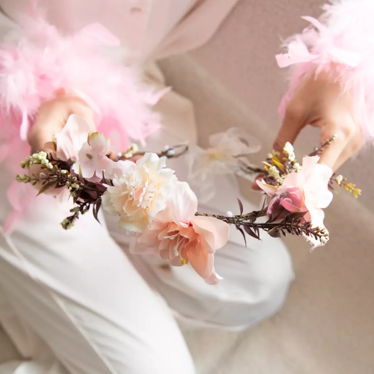 - Śliczny wianek na głowę z kwiatami w kolorach brzoskwiniowym, różowym i ecru, dodatkowo ozdobionych drobnymi gałązkami