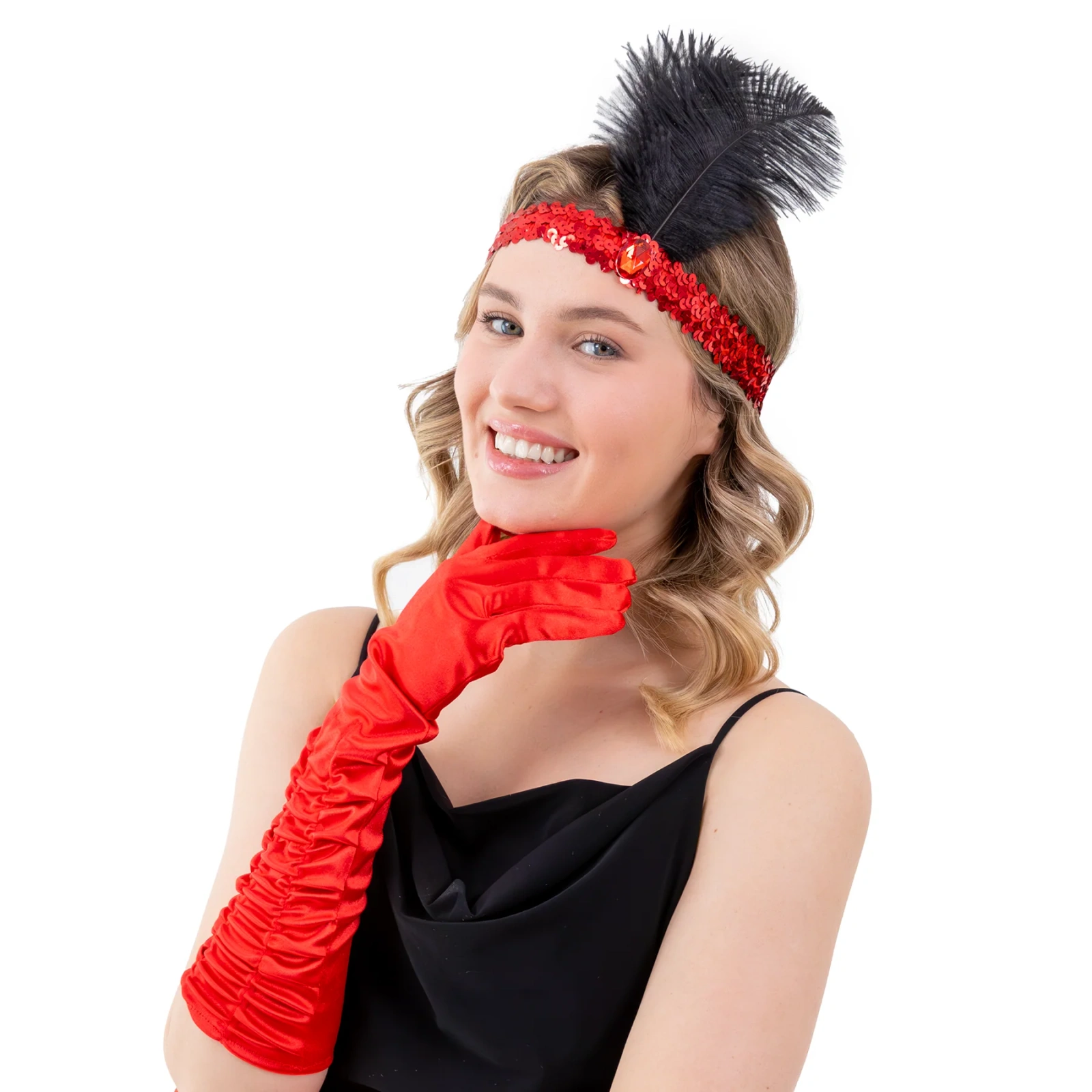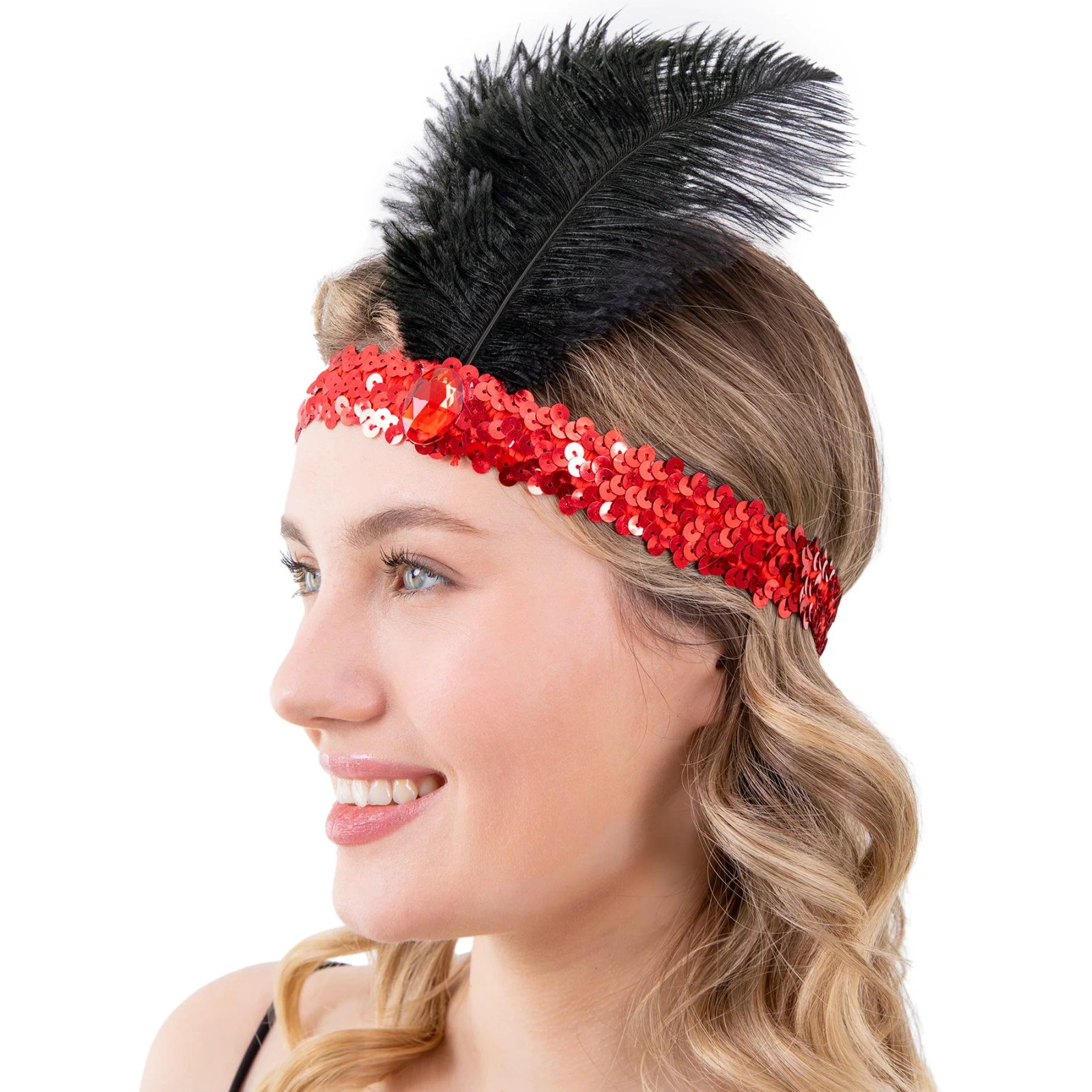 Czerwona opaska z cekinami i piórami – efektowny dodatek w stylu lat 20. na bale, studniówki i imprezy tematyczne