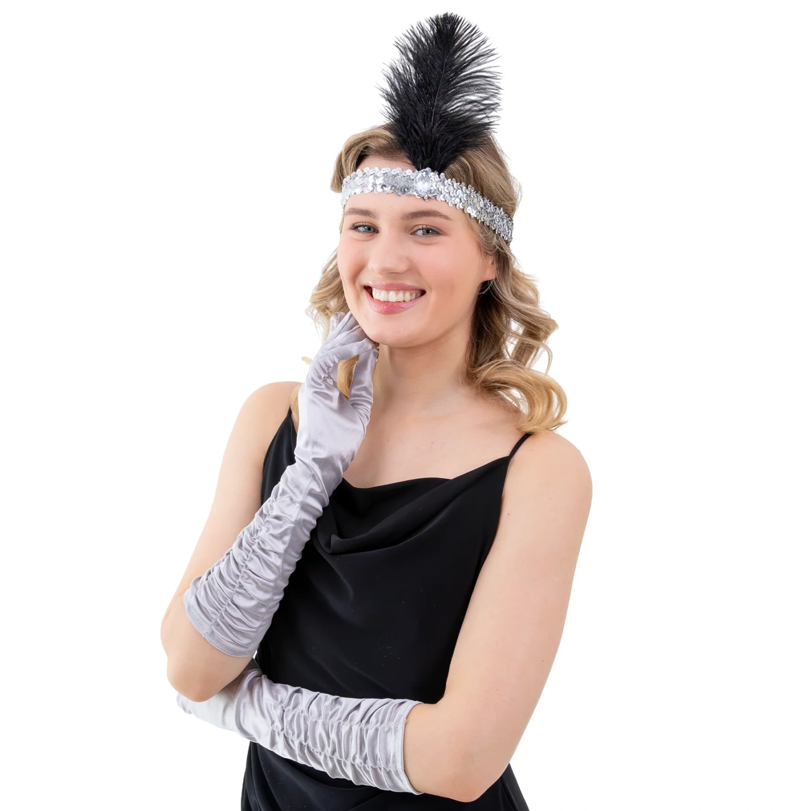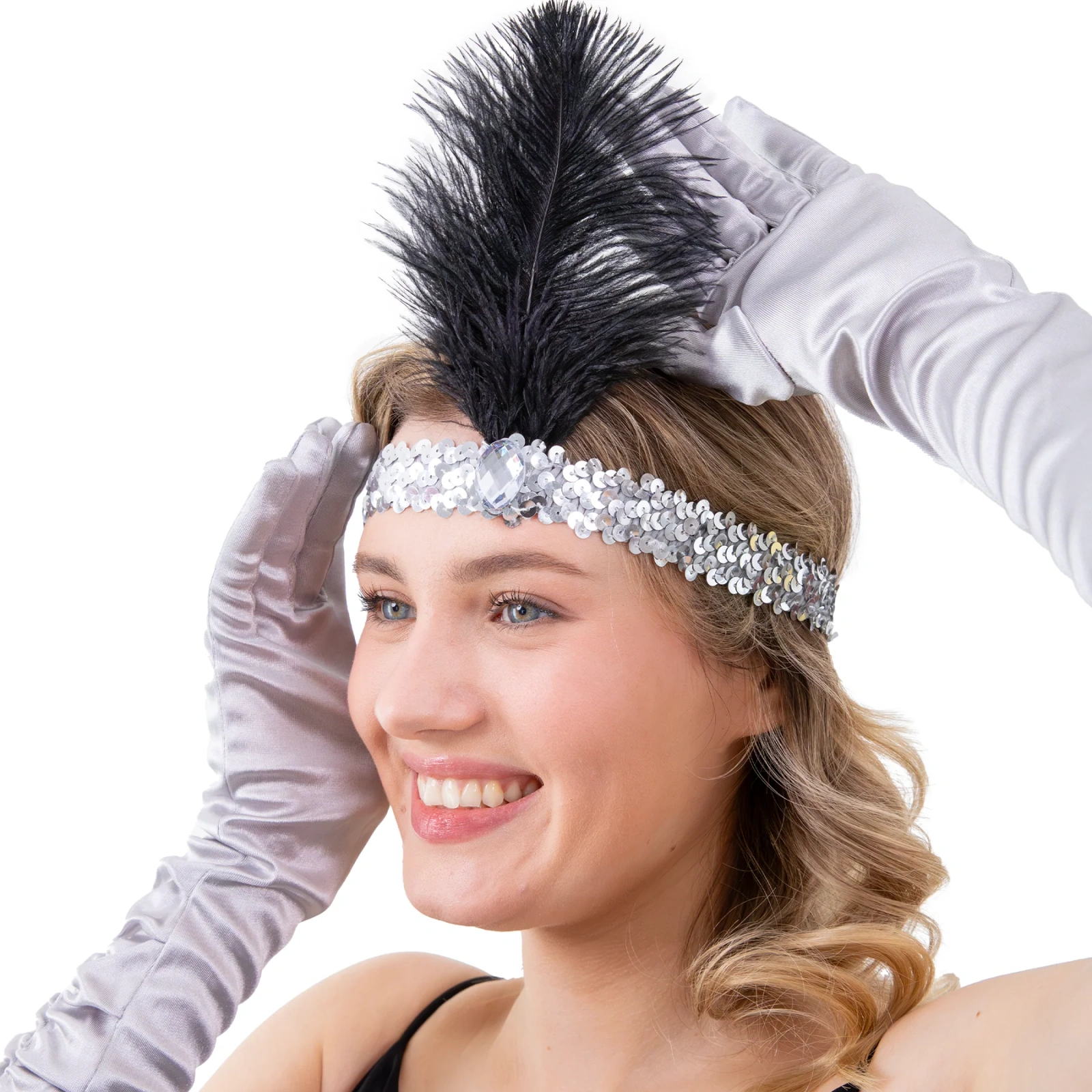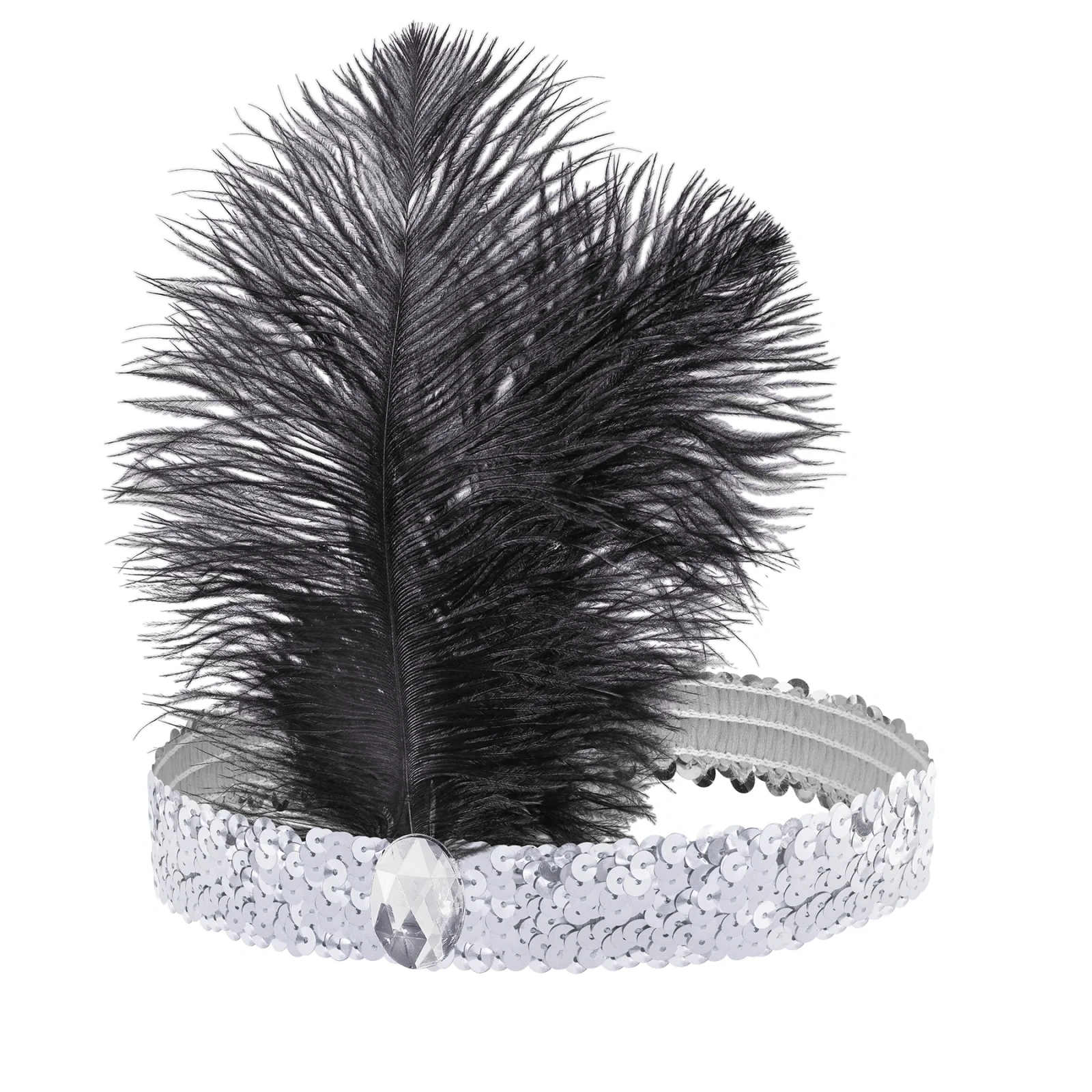 Elegancka opaska inspirowana złotą erą jazzu to efektowny dodatek, który w kilka chwil odmieni każdą stylizację wieczorową. Błyszcząca, srebrna taśma obszyta cekinami pięknie odbija światło, a okazałe czarne pióra i dekoracyjny kryształ tworzą spektakularną kompozycję rodem z lat 20. XX wieku. To idealne uzupełnienie przebrania na imprezę w stylu Great Gatsby, bal karnawałowy, wieczór tematyczny czy sesję zdjęciową z nutą glamour.