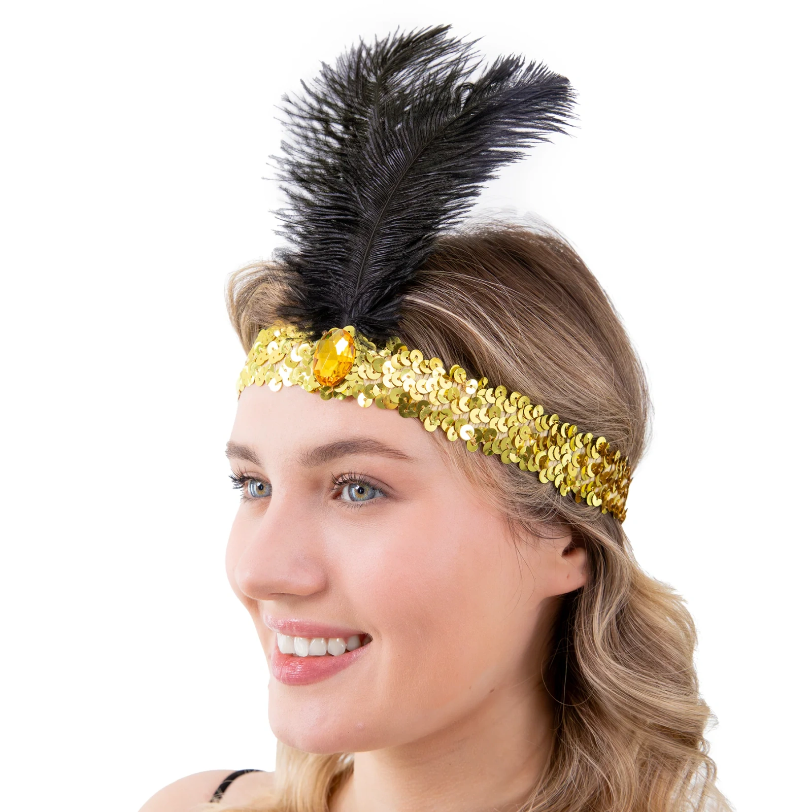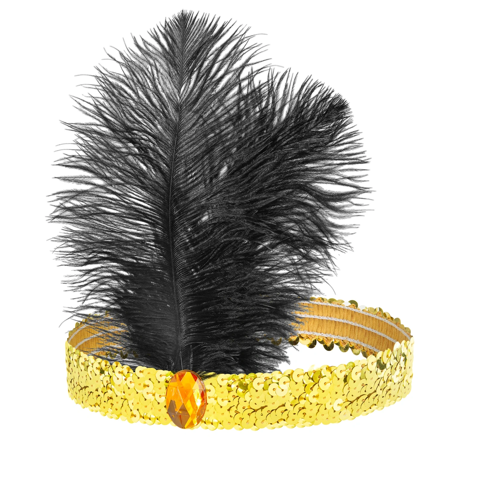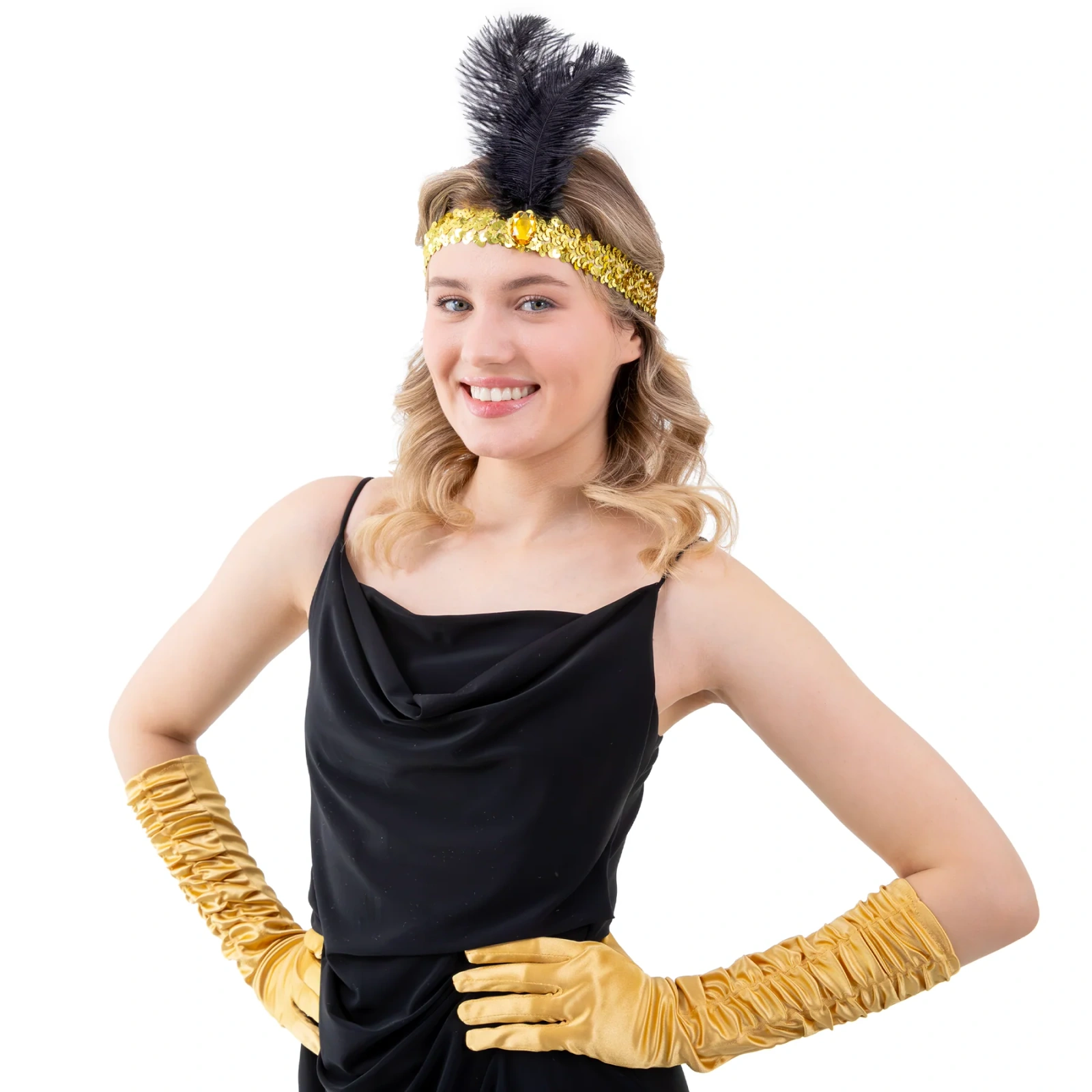 Dodaj swojemu przebraniu prawdziwego, filmowego blasku dzięki eleganckiej opasce z cekinami i piórami inspirowanej modą lat 20. XX wieku. To efektowny dodatek, który natychmiast przywołuje klimat klubów jazzowych, szalonych imprez w rytmie charlestona i ekskluzywnych przyjęć w stylu „Wielkiego Gatsby’ego”. Złote wykończenie i czarne, strzeliste pióra sprawiają, że opaska przyciąga wzrok z daleka i pięknie komponuje się zarówno z klasyczną „małą czarną”, jak i z bogato zdobionymi sukienkami wieczorowymi.